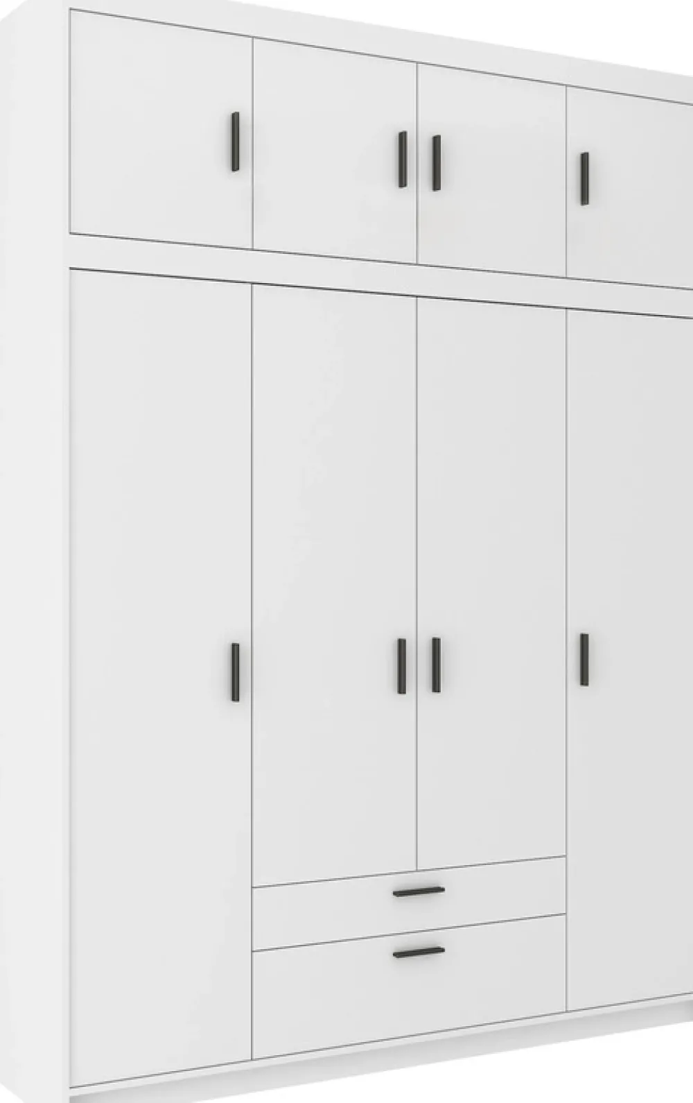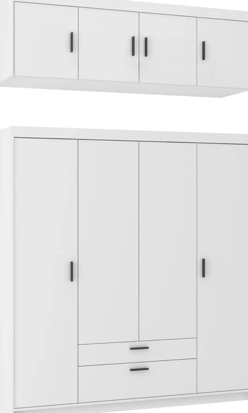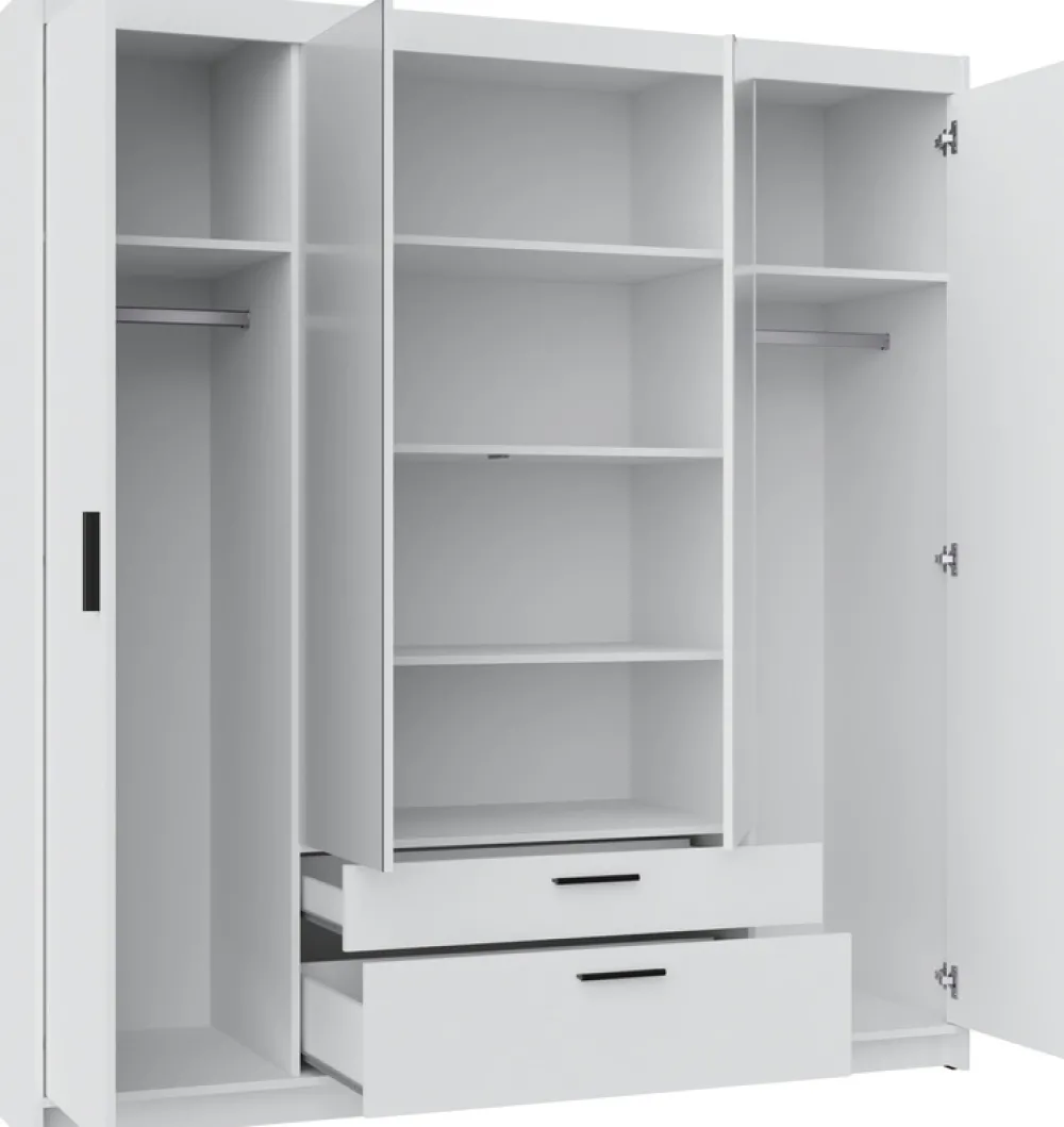 - Szafa 4-drzwiowa: 176,3 × 190,5 × 53 cm – 5 półek + 2 szuflady + 2 drążki