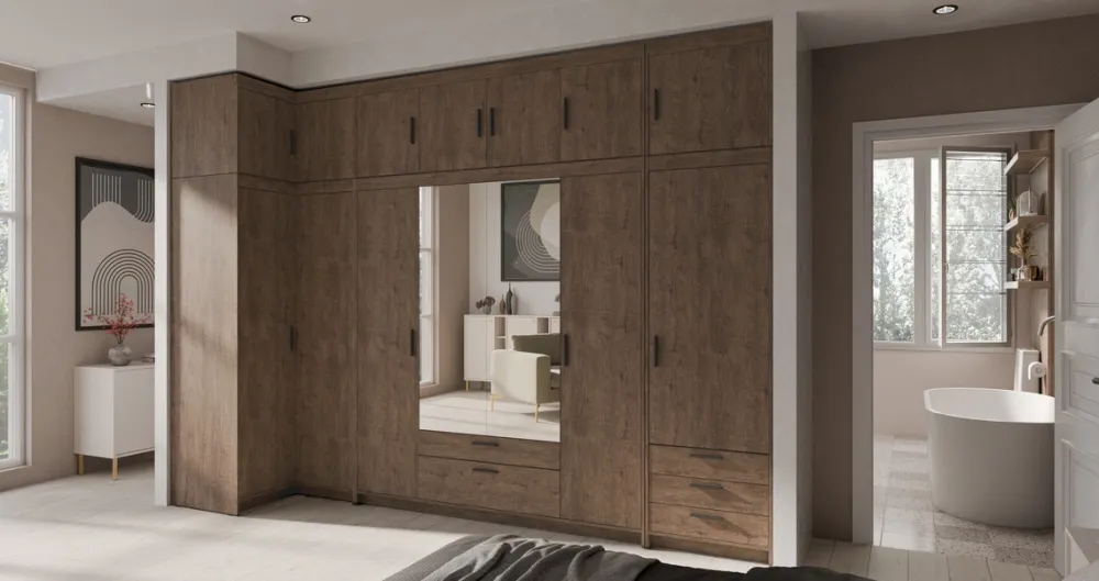 Szafa modułowa KUBA – nowoczesna zabudowa w kolorze dąb lefkas z lustrzanym wykończeniem