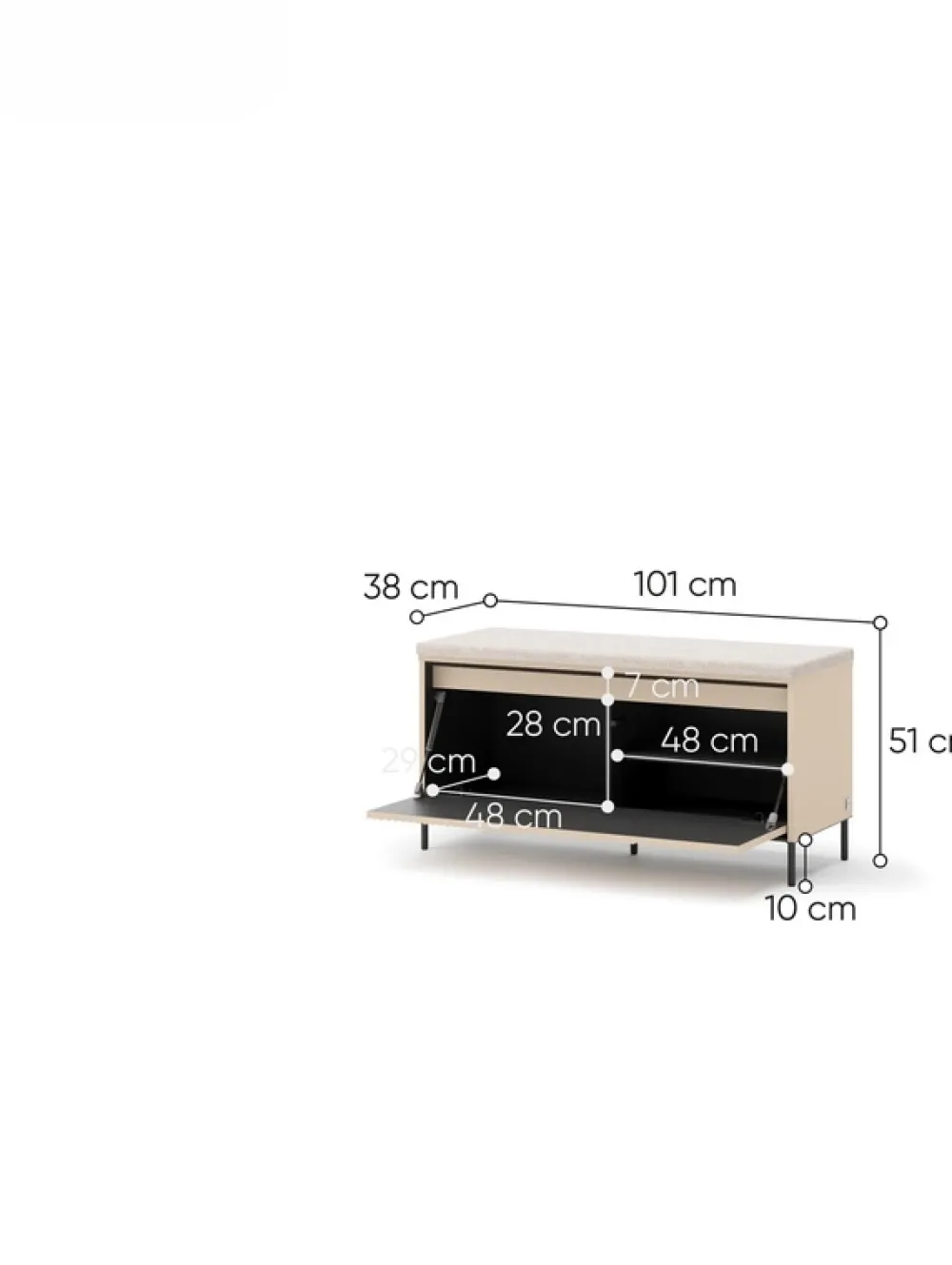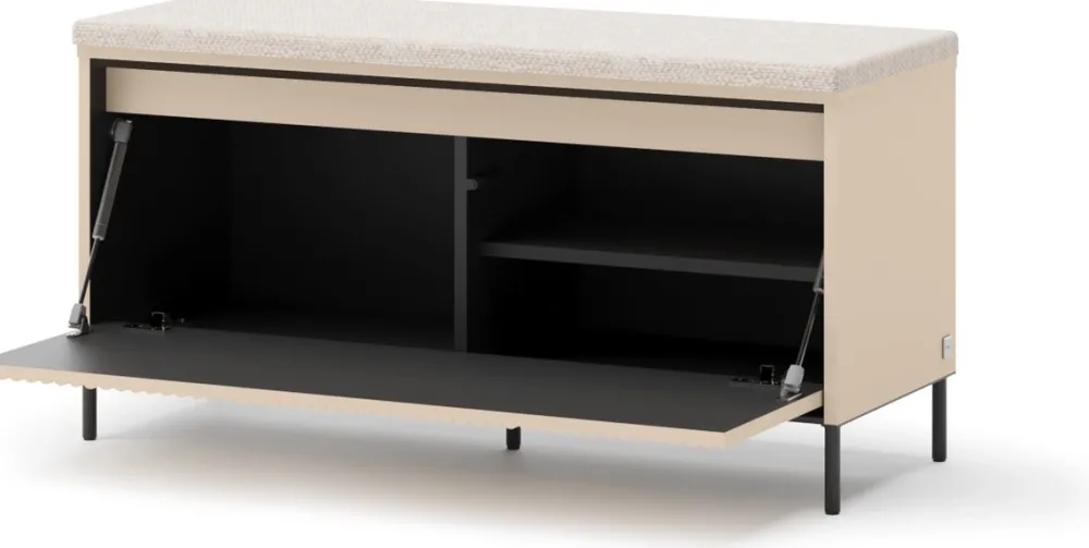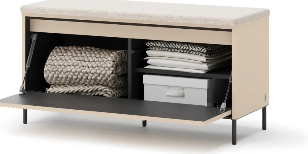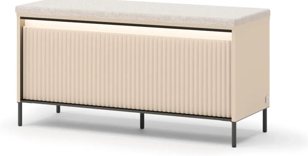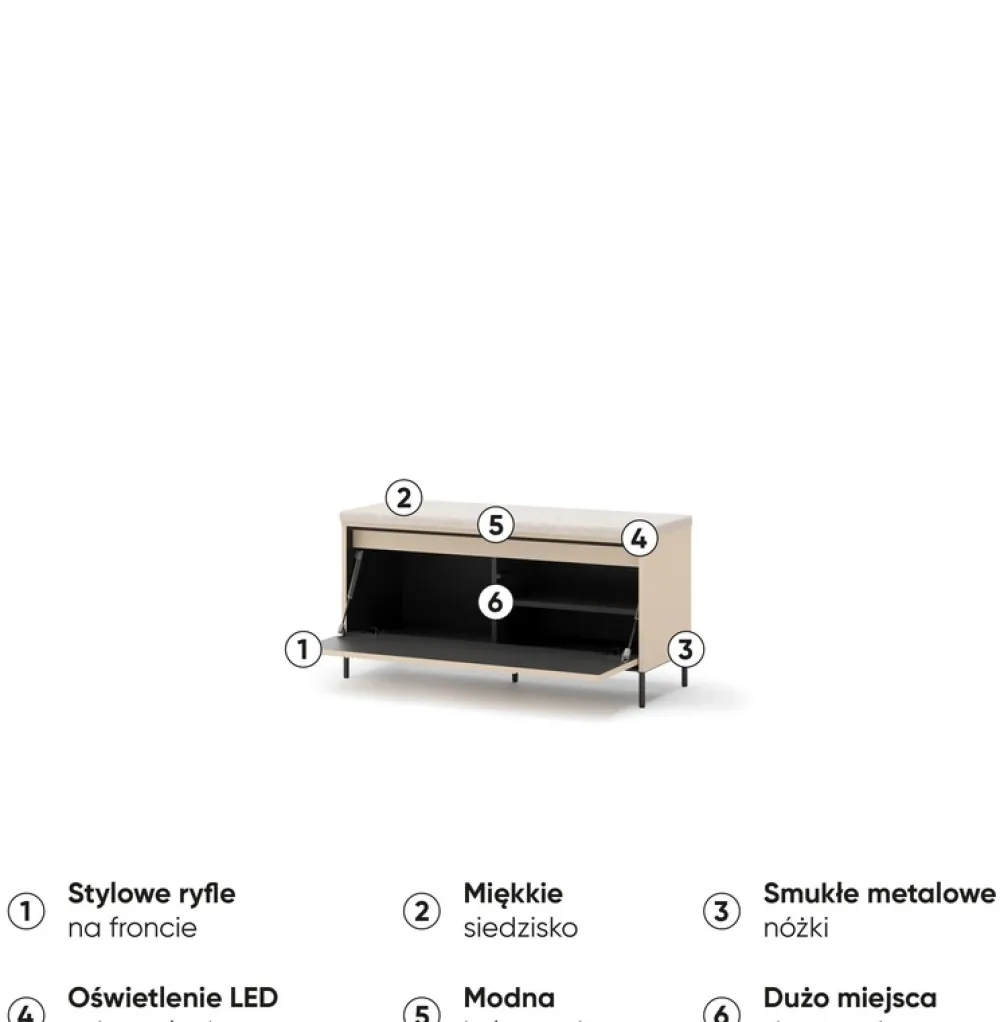 - Ławka do przedpokoju z oświetleniem LED, miękkim siedziskiem i ryflowanym frontem. Stylowy design, praktyczny schowek i push-open – idealna do garderoby, holu lub wiatrołapu. Kolor: beż piaskowy / czarny.