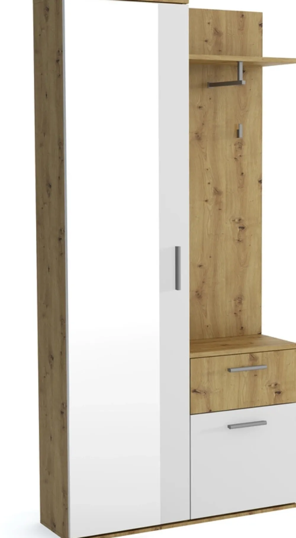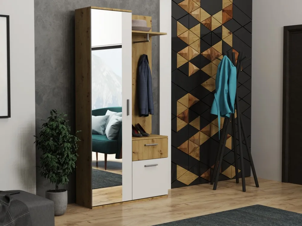 - Garderoba do przedpokoju z lustrem JOVITA wyposażona została w praktyczne wieszaki, półkę z drążkiem oraz szafkę na buty, nad którą znajduje się szuflada. Po lewej stronie garderoby za drzwiami z lustrem znajdują się półki.