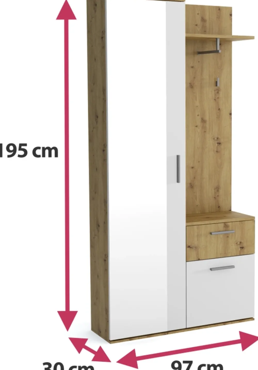 Wysokość garderoby wynosi 195 cm, co czyni ją wygodnym i pojemnym meblem, który zapewnia mnóstwo przestrzeni do przechowywania. Praktyczna szuflada to świetne miejsce na drobne przedmioty, takie jak klucze czy rękawiczki, a szafka na buty pozwala na zachowanie porządku i estetyki w przedpokoju.