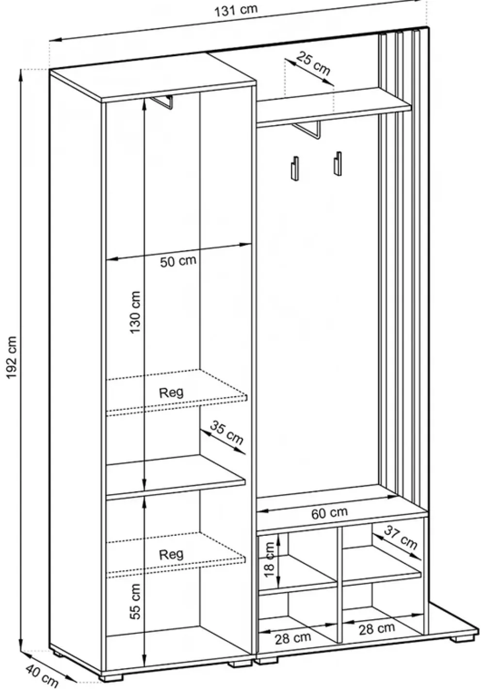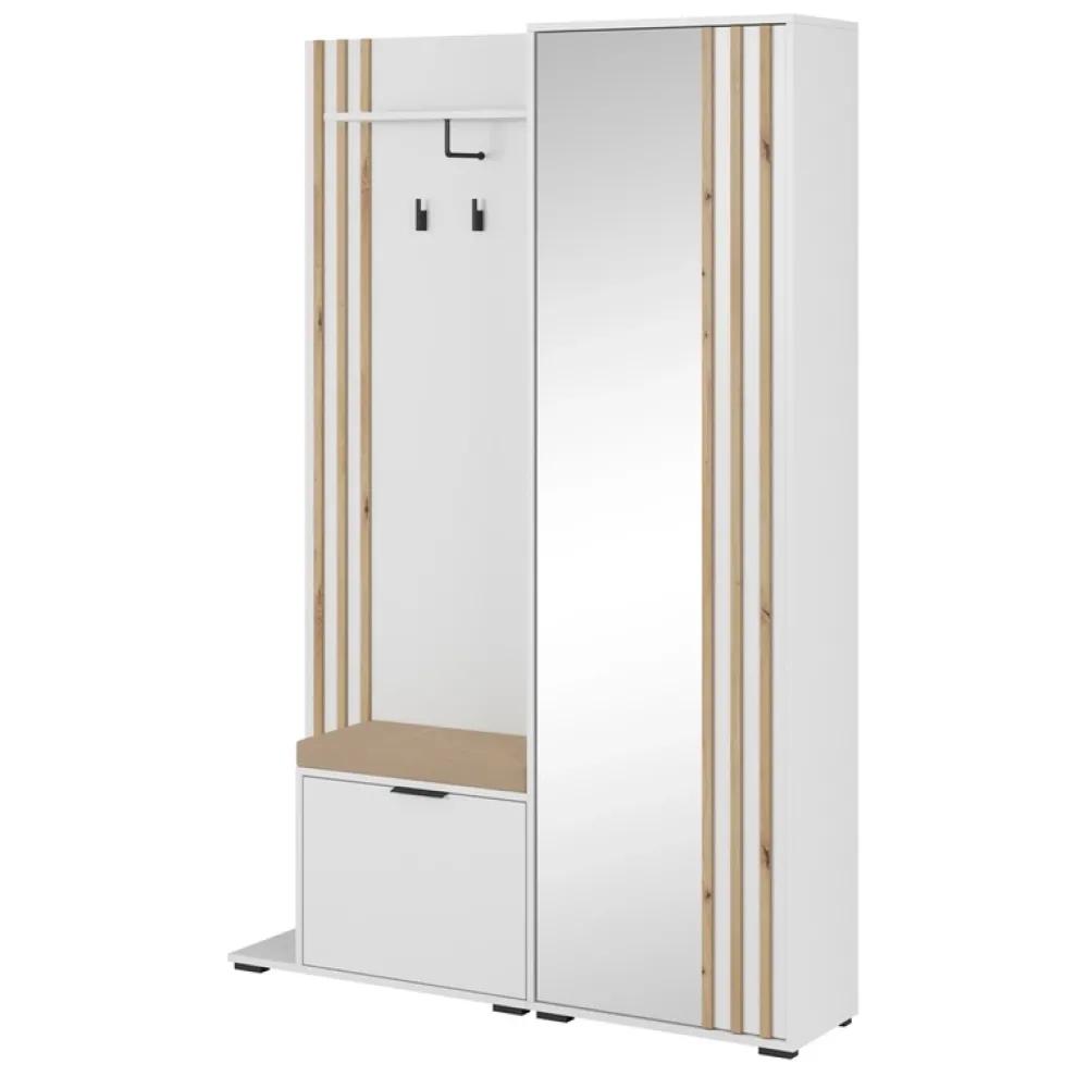 - Biała garderoba do przedpokoju NAVE została wyposażona w lustro znajdujące się na drzwiach, za którymi swoje miejsce znalazły trzy półki oraz uchwyt na wieszaki. Garderoba posiada również szafkę na buty z dwoma poziomami, trzy wieszaki oraz półkę.