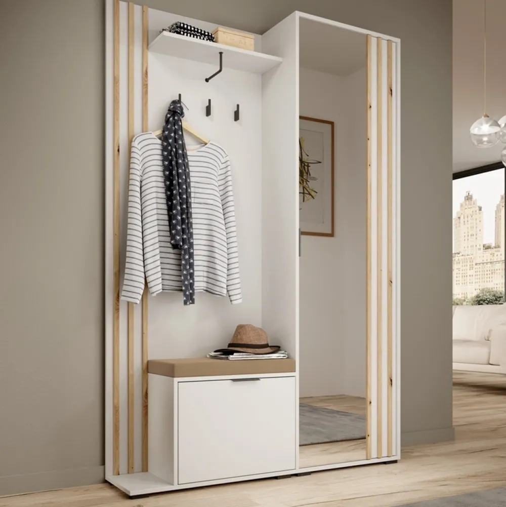 Siedzisko, umiejscowione nad szafką na buty, stanowi idealne miejsce do zdejmowania obuwia po długim dniu. Jego miękkie wykończenie zachęca do chwili relaksu, a jednocześnie jest łatwe w czyszczeniu i utrzymaniu.