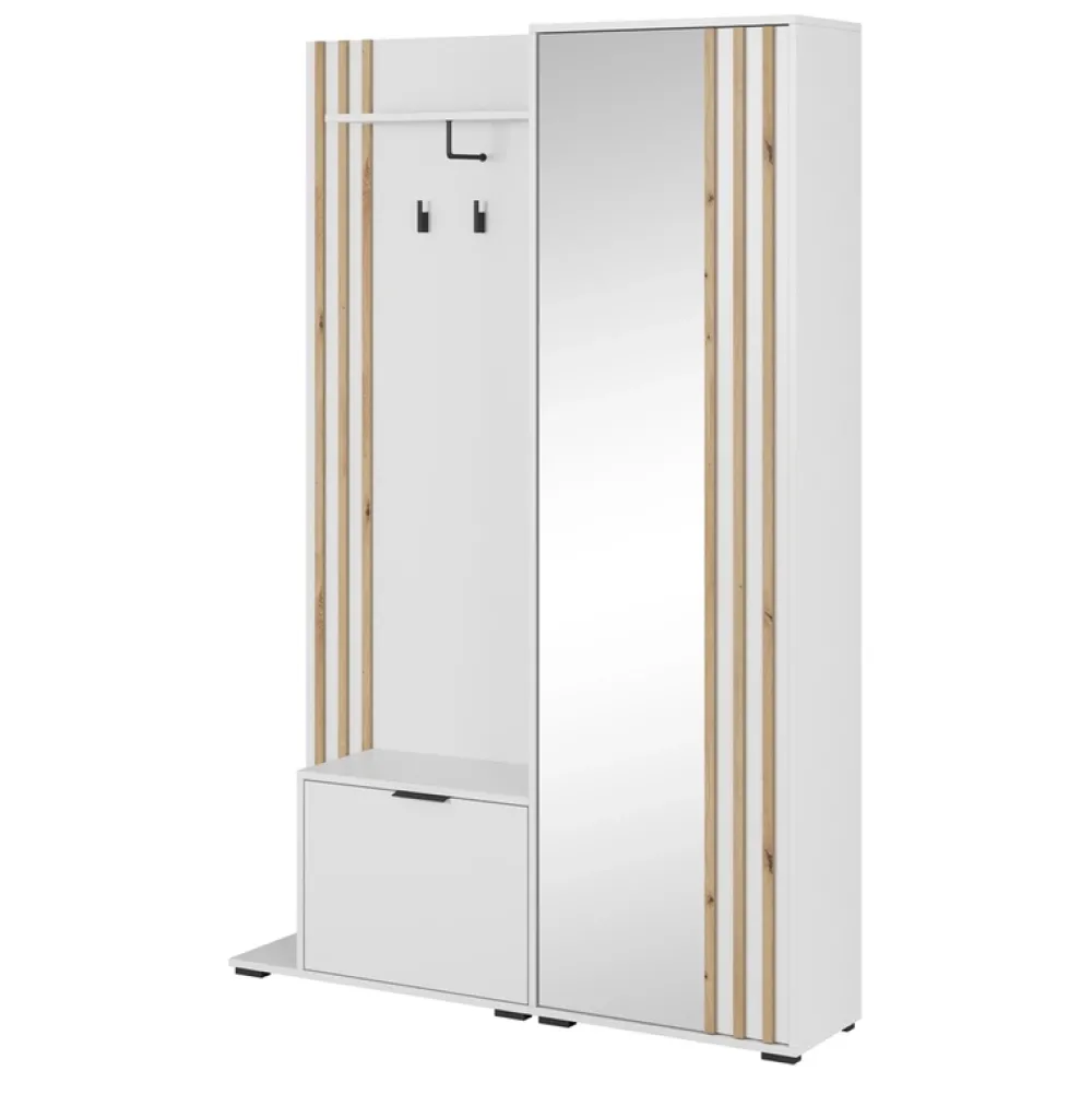 - Garderoba do przedpokoju NAVE została wyposażona w drzwi z lustrem za którymi znajdują się trzy półki oraz miejsce na wieszaki. Dodatkowo garderoba posiada trzy wieszaki oraz półkę, u dołu znajduje się szafka na buty z półkami.