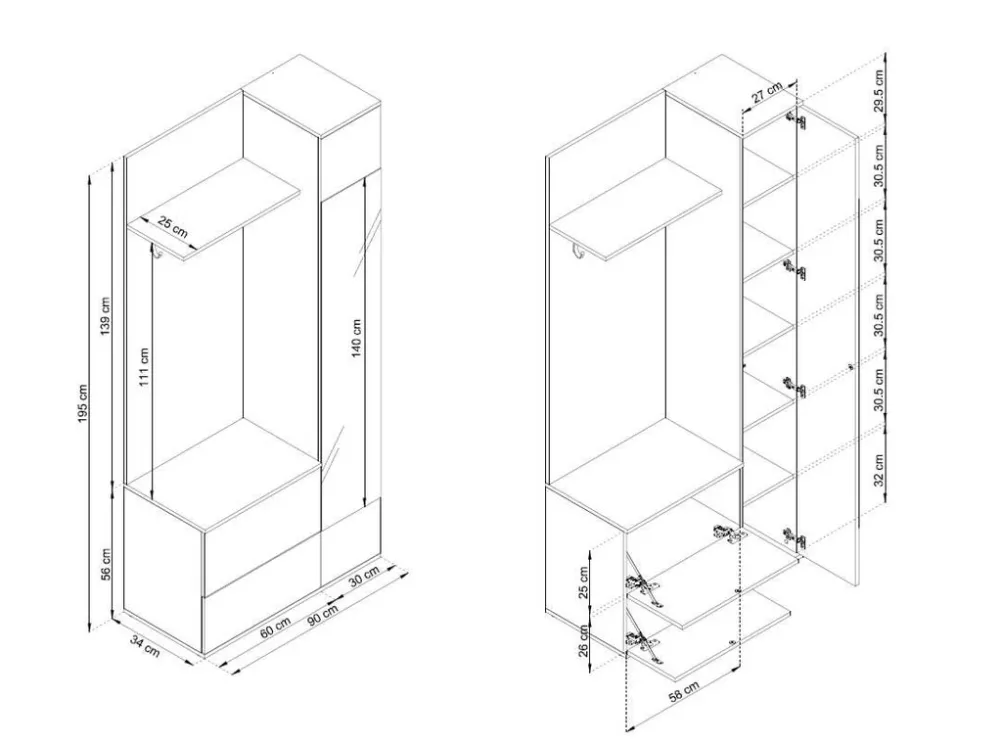 - Szafka na buty wyposażona w dwie uchylane półki;
