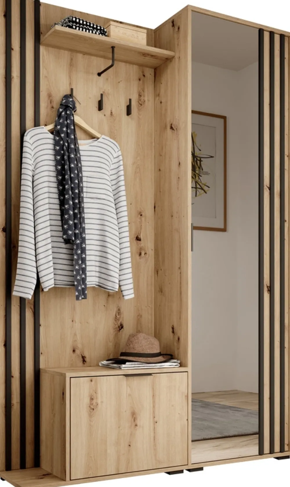Stwórz perfekcyjnie zorganizowaną i elegancką przestrzeń wejściową dzięki garderobie o szerokości 131 cm. Praktyczne rozwiązania, takie jak szafa z lustrem, szafka na buty oraz dodatkowe wieszaki, pozwalają na wygodne przechowywanie odzieży i obuwia, jednocześnie wprowadzając do wnętrza nowoczesny styl.