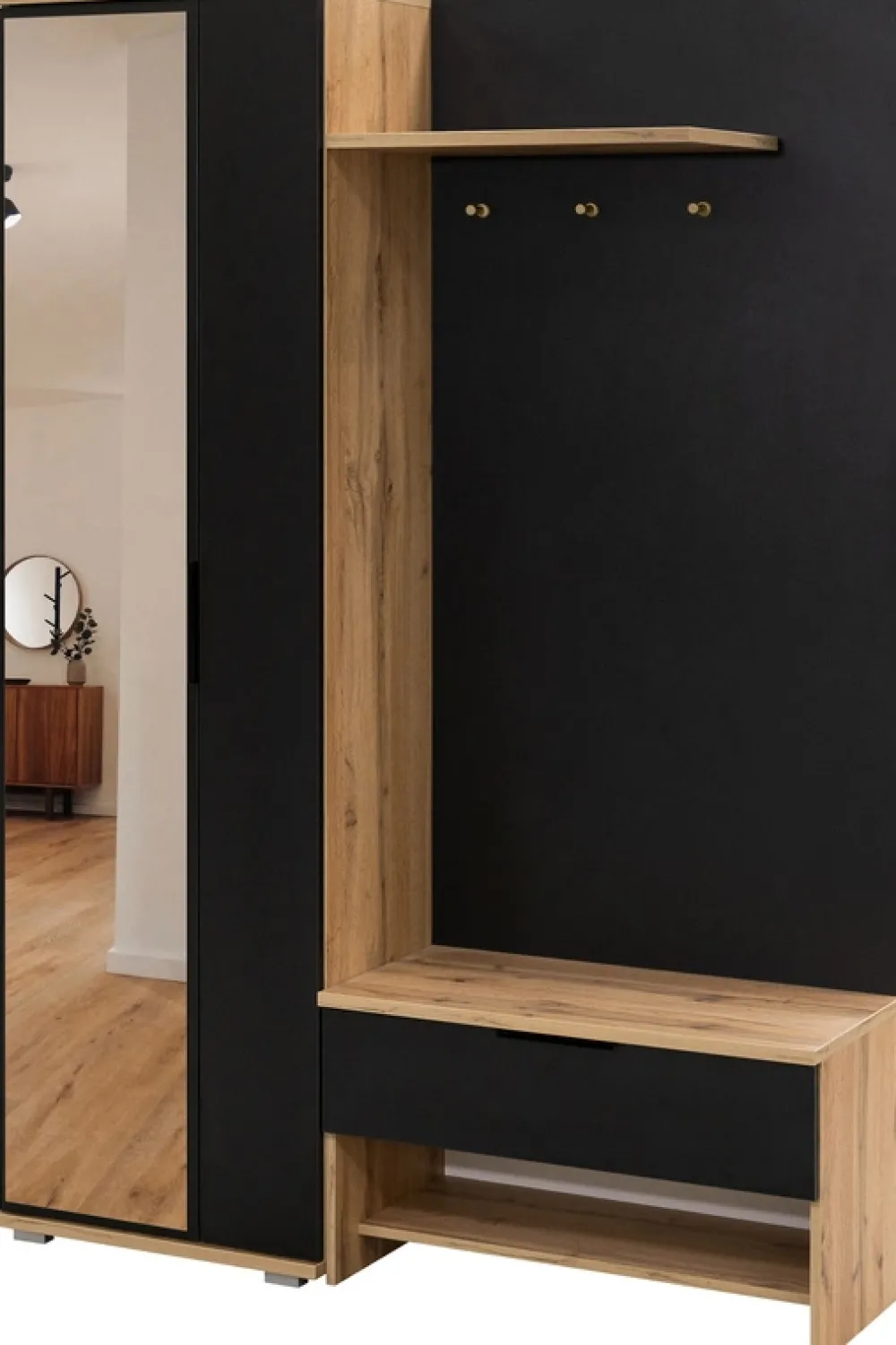 Po prawej stronie garderoby znajdziemy górną, otwartą półkę, która świetnie sprawdzi się do przechowywania torebek, kapeluszy czy innych codziennych akcesoriów. Pod nią umieszczono trzy wieszaki, które umożliwiają wygodne przechowywanie odzieży, a na samym dole garderoby znajduje się praktyczna szuflada. Szuflada osadzona jest na prowadnicach rolkowych, co gwarantuje płynne otwieranie i zamykanie, zapewniając wygodny dostęp do drobniejszych rzeczy.