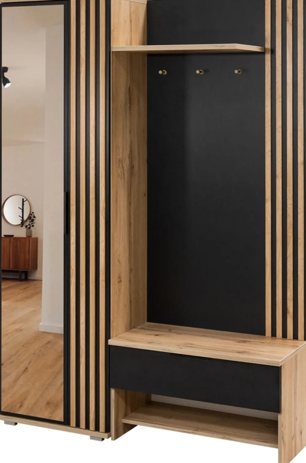 Po prawej stronie garderoby znajdziemy górną, otwartą półkę, która świetnie sprawdzi się do przechowywania torebek, kapeluszy czy innych codziennych akcesoriów. Pod nią umieszczono trzy wieszaki, które umożliwiają wygodne przechowywanie odzieży, a na samym dole garderoby znajduje się praktyczna szuflada. Szuflada osadzona jest na prowadnicach rolkowych, co gwarantuje płynne otwieranie i zamykanie, zapewniając wygodny dostęp do drobniejszych rzeczy.