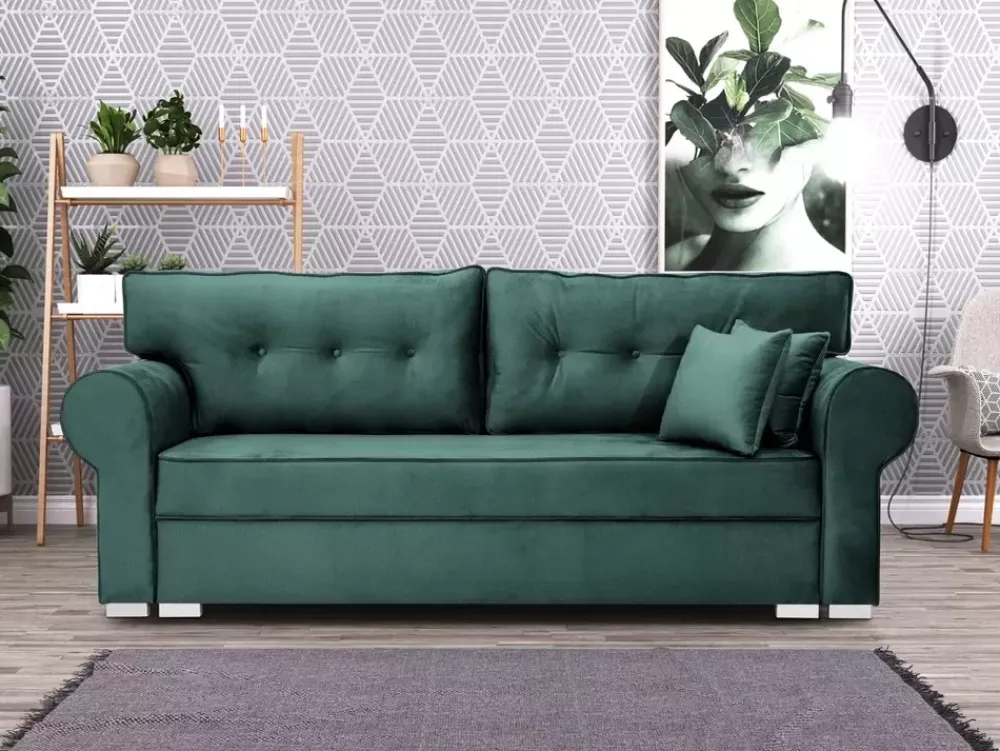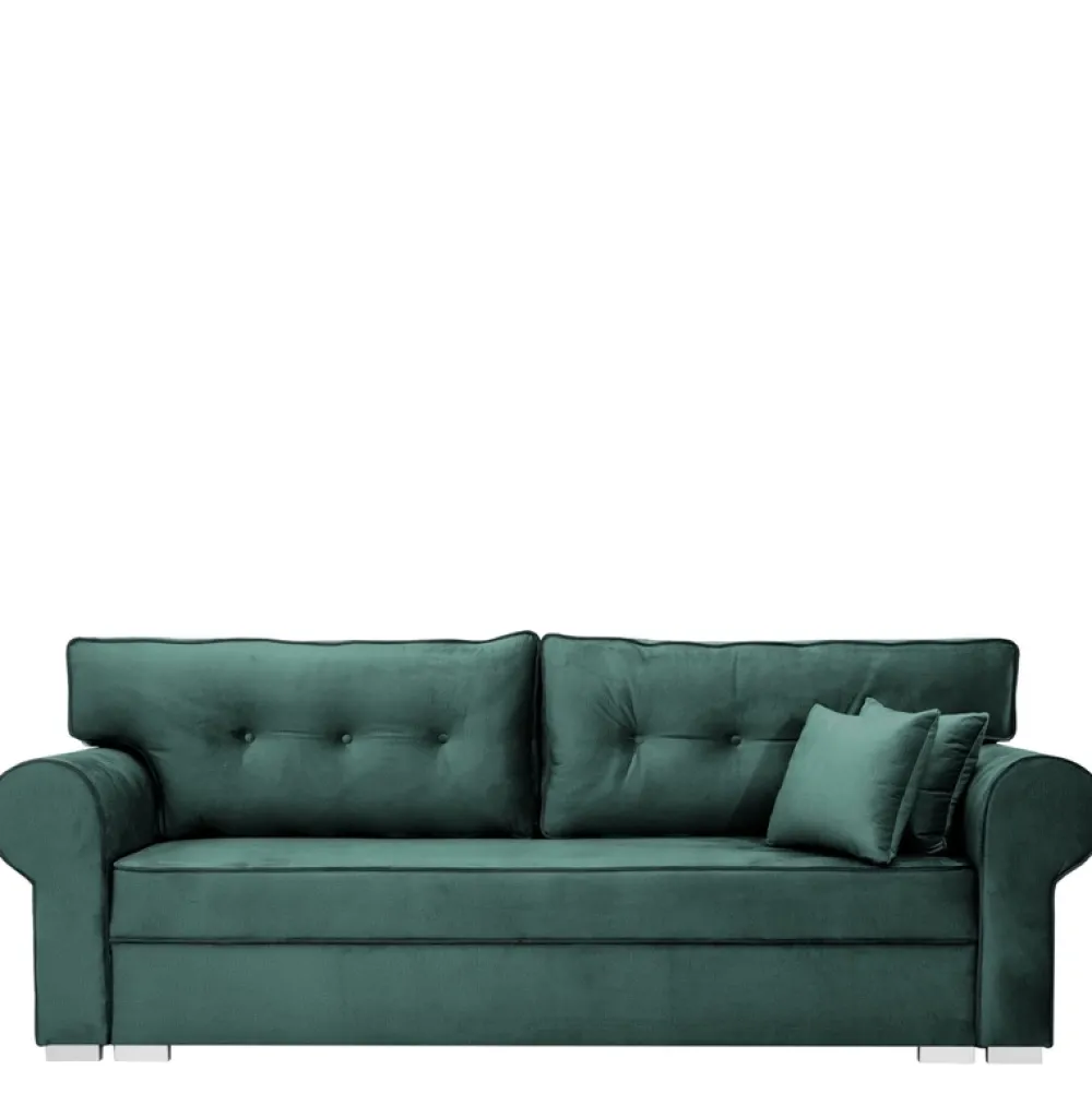 To, co od razu zwróci uwagę to dwie duże poduchy, które poza wygodnym oparciem, nadają meblowi charakteru i elegancji. Ozdobione zostały guzikami tapicerskimi, co w połączeniu z zaokrąglonymi boczkami sprawia, że sofa świetnie wpiszę się we wnętrza w stylu glamour jak i te nowoczesne. Dwie małe poduszki dopełniają komplet, umożliwiając wybór najwygodniejszej pozycji.