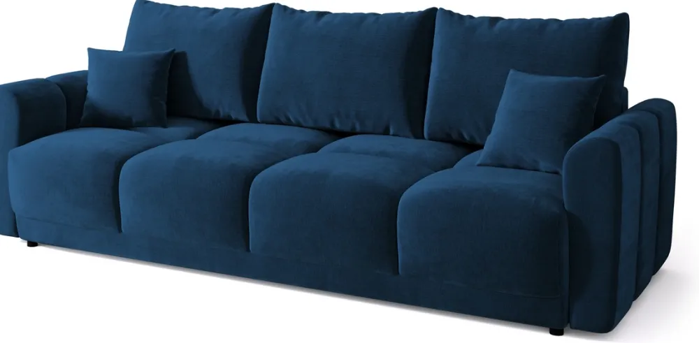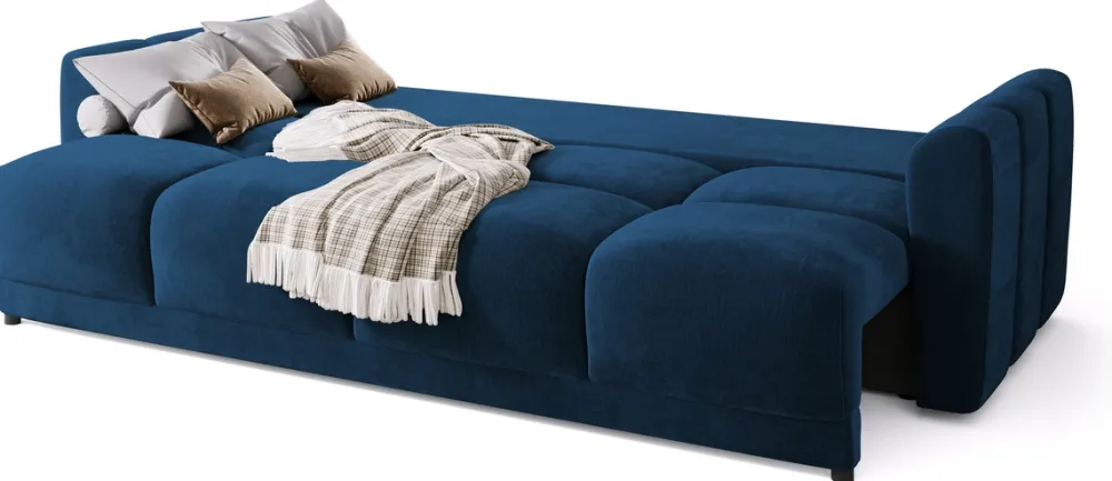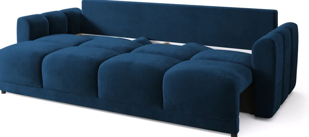 - Rozkładana kanapa z funkcją spania NUBES obita jest welurową tkaniną oraz posiada przestronny pojemnik na pościel. W zestawie z kanapą dołączone są trzy duże poduchy. Kanapa rozkłada się za pomocą mechanizmu DL. Nóżki wykonane są z tworzywa.