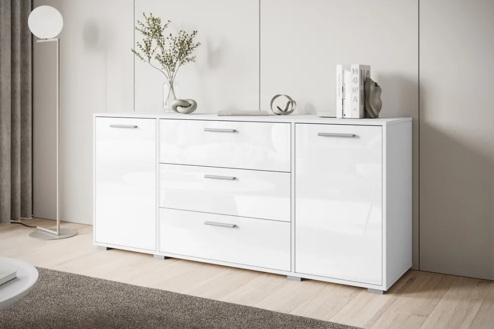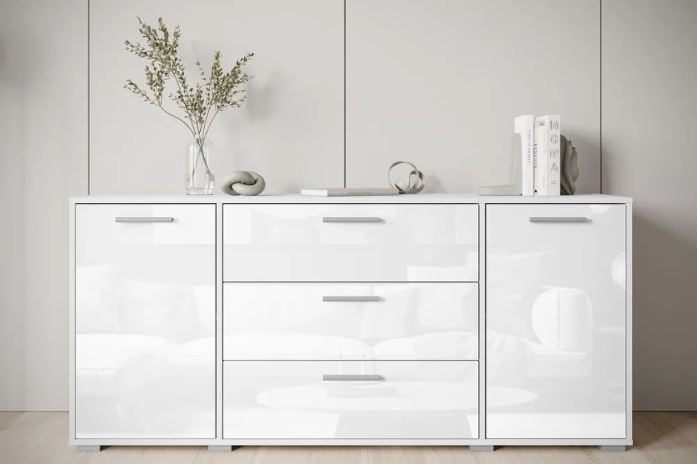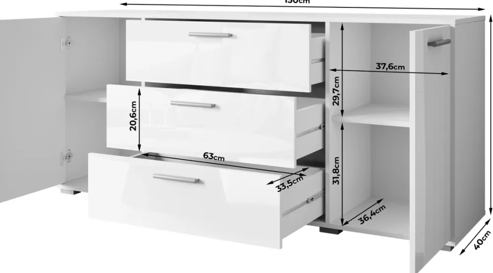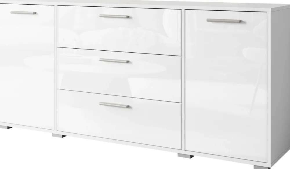 - Biała komoda do salonu BUENO wyposażona została w trzy szuflady w środkowej części oraz dwoje drzwi, za którymi kryją się po 2 półki na stronę. Mebel wykonany został z płyty laminowanej o grubości 15 mm. Nóżki i uchwyty w kolorze aluminium.
