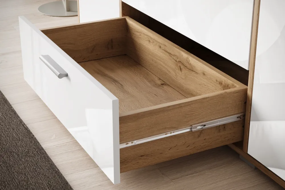 - Fronty komody wykończone w połysku zostały wykonane z płyty laminowanej o grubości 15 mm.