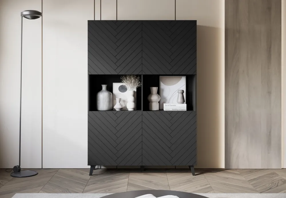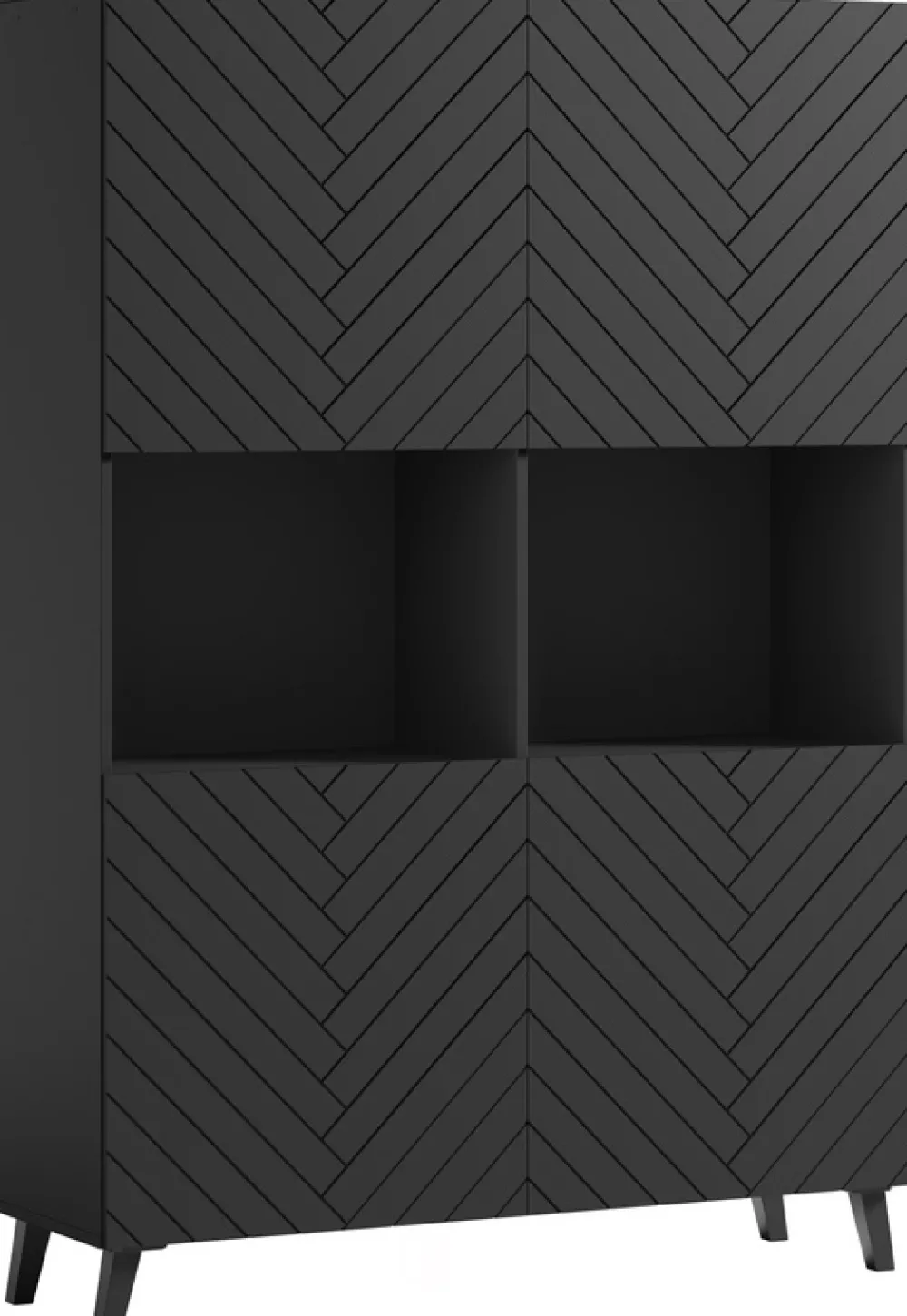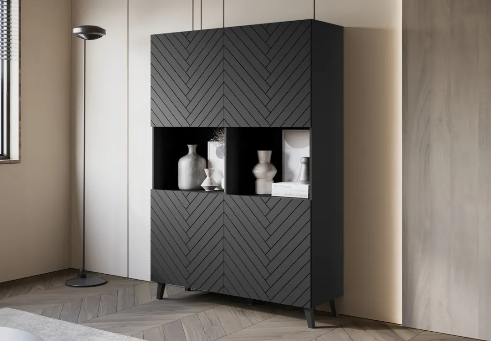 Wysoka komoda do salonu PUNES to elegancki i funkcjonalny mebel, który doskonale pasuje do nowoczesnych wnętrz. Jest utrzymana w minimalistycznym stylu, z frontami z frezowanym wzorem jodełki dodającymi jej subtelnego uroku i elegancji. Korpus komody wykonany jest z płyty laminowanej o grubości 15 mm, co zapewnia jej trwałość i solidność. Fronty z wysokiej jakości płyty MDF o grubości 16 mm są zabezpieczone wodoodporną folią, która chroni mebel przed wilgocią i ułatwia jego czyszczenie.