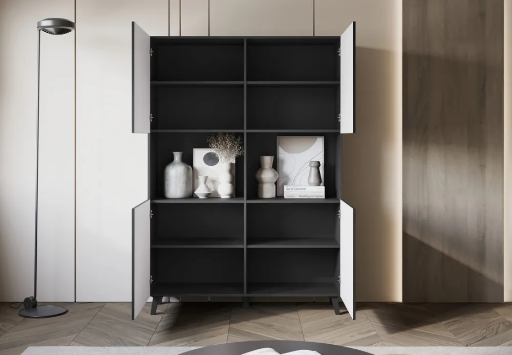 Wysoka komoda do salonu PUNES wyposażona jest w cztery drzwi, za którymi kryją się półki. Dodatkowo wysokość półek można regulować, co pozwala na dostosowanie przestrzeni według indywidualnych potrzeb. Na środku komody znajdują się dwie wnęki idealnie do wyeksponowania dekoracji czy pamiątek.