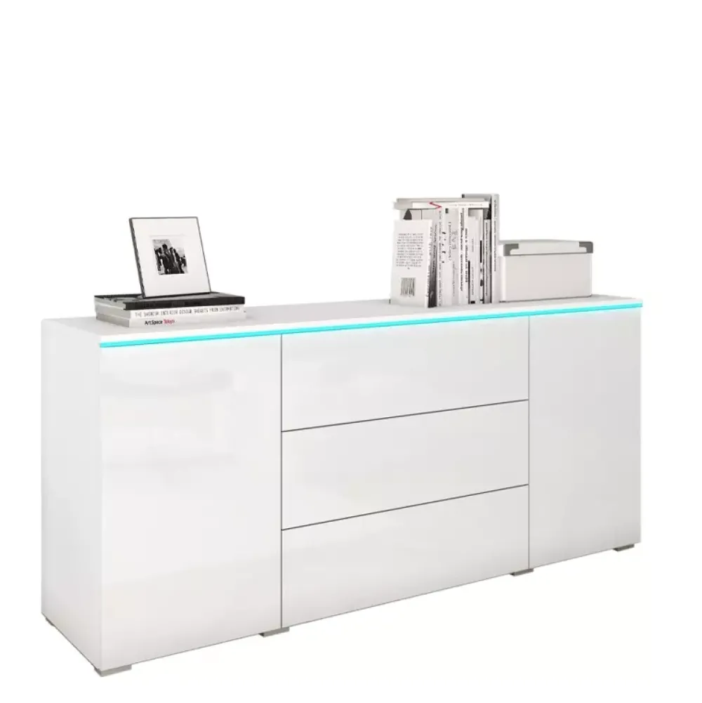 Nowoczesna komoda VELLORE to idealne rozwiązanie do małego salonu, do sypialni lub do biura. Komoda z szufladami pracującymi na niezawodnych prowadnicach rolkowych zapewni dużo miejsca do przechowywania, którego brakuje niemalże w każdym domu. Po zewnętrznych stronach komoda posiada po jednej półce z płyty laminowanej. Biała komoda odświeży wnętrze w którym się znajdzie, a dodatkowo fronty w połysku optycznie je powiększą. Ciekawą opcją jest możliwość podświetlenia górnego blatu tej białej komody dostępnym w naszej ofercie oświetleniem led.