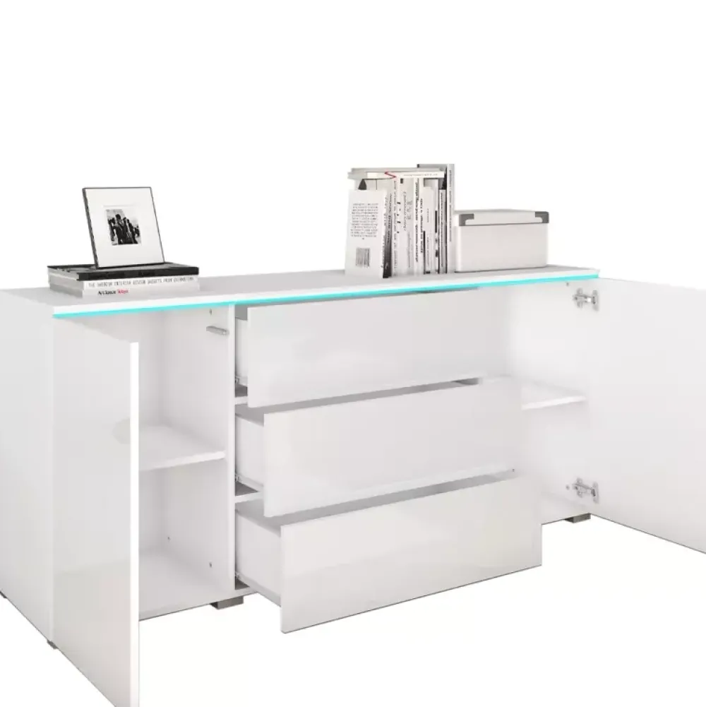 - Biała komoda z frontami na wysoki połysk ma 150 cm szerokości. Komoda posiada trzy pojemne szuflady umieszczone w środkowej części i po dwie wnęki po zewnętrznych stronach.