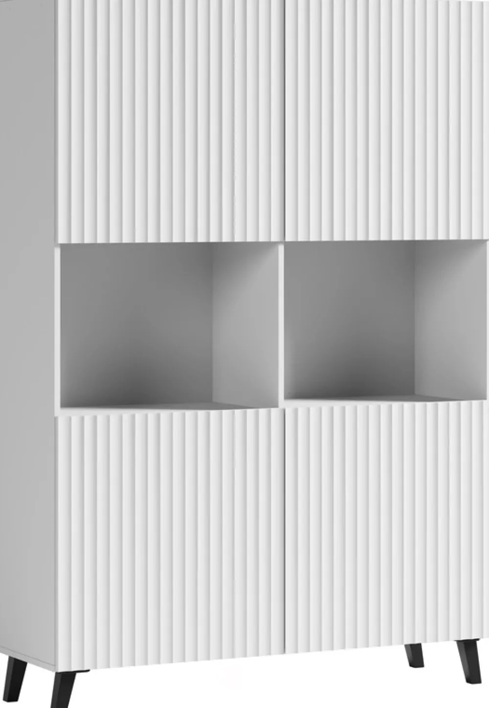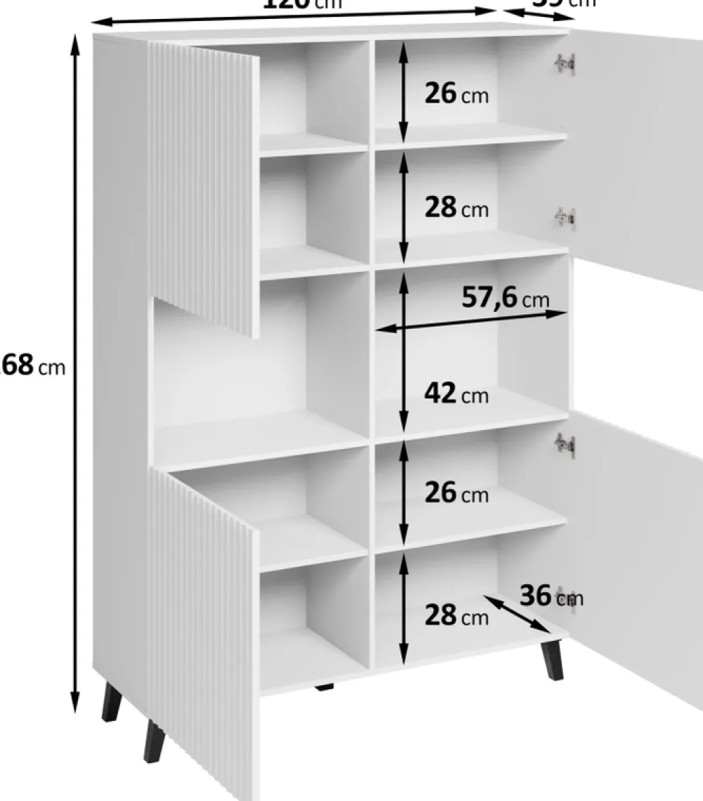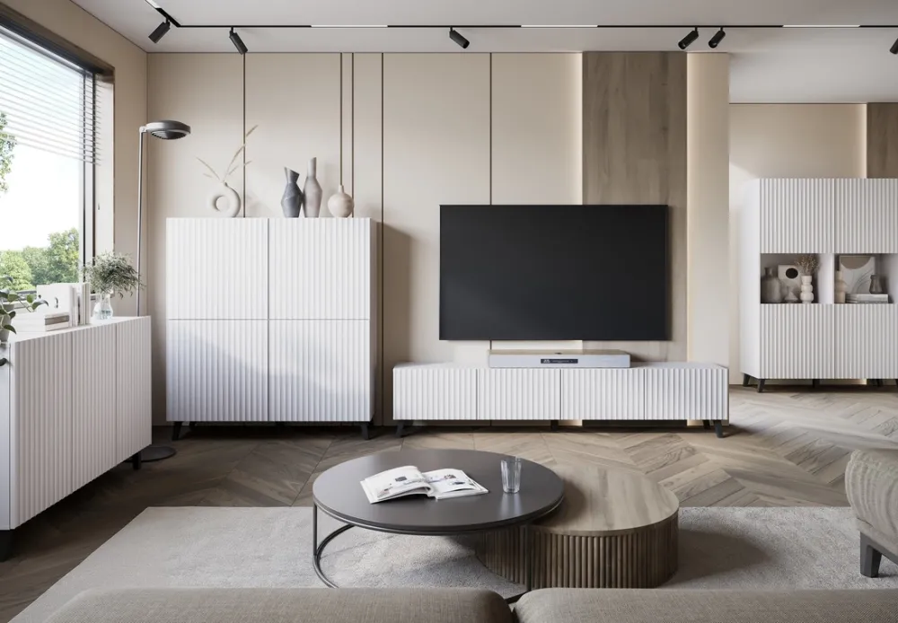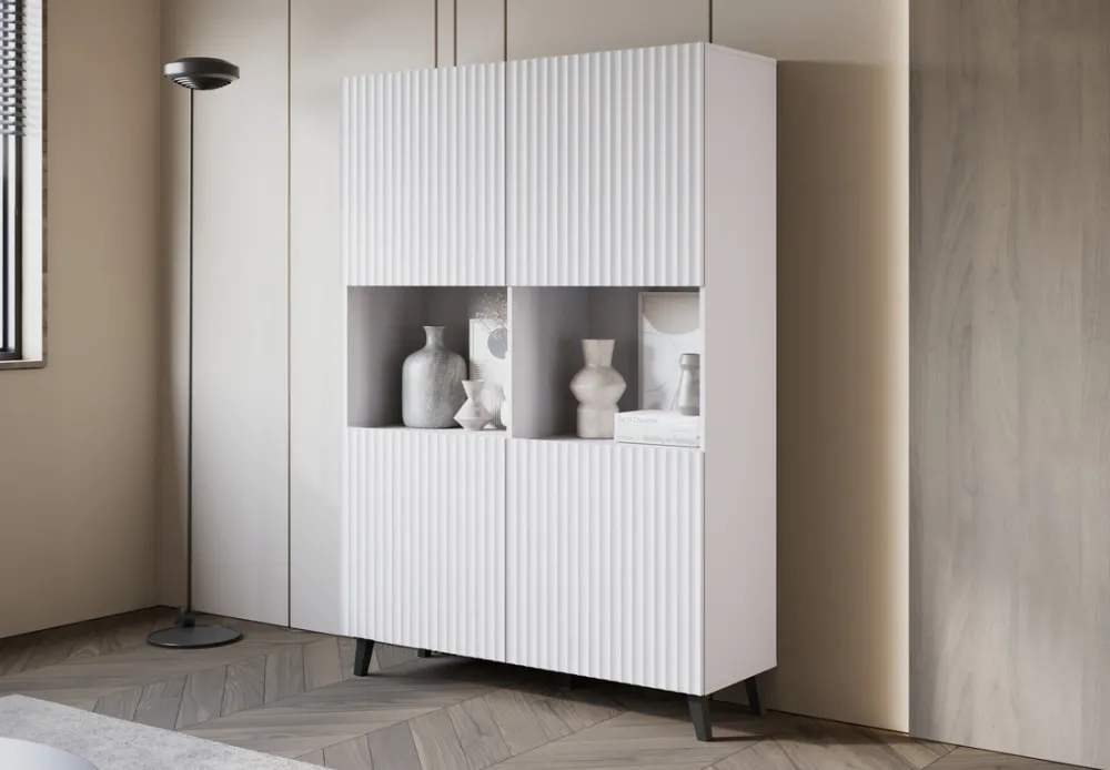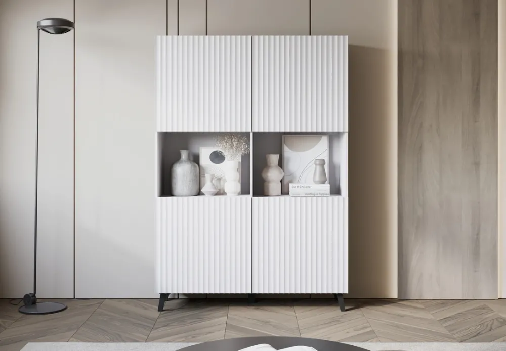 Wysoka komoda do salonu PUNES to elegancki i funkcjonalny mebel, który doskonale pasuje do nowoczesnych wnętrz. Jest utrzymana w minimalistycznym stylu, z ryflowanymi frontami dodającymi jej subtelnego uroku i elegancji. Korpus komody wykonany jest z płyty laminowanej o grubości 15 mm, co zapewnia jej trwałość i solidność. Fronty z wysokiej jakości płyty MDF o grubości 18 mm są zabezpieczone wodoodporną folią, która chroni mebel przed wilgocią i ułatwia jego czyszczenie.