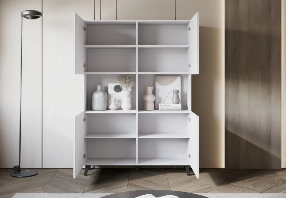 Biała komoda do salonu PUNES wyposażona jest w cztery drzwi, za którymi kryją się półki. Dodatkowo wysokość półek można regulować, co pozwala na dostosowanie przestrzeni według indywidualnych potrzeb. Na środku komody znajdują się dwie wnęki idealnie do wyeksponowania dekoracji czy pamiątek.