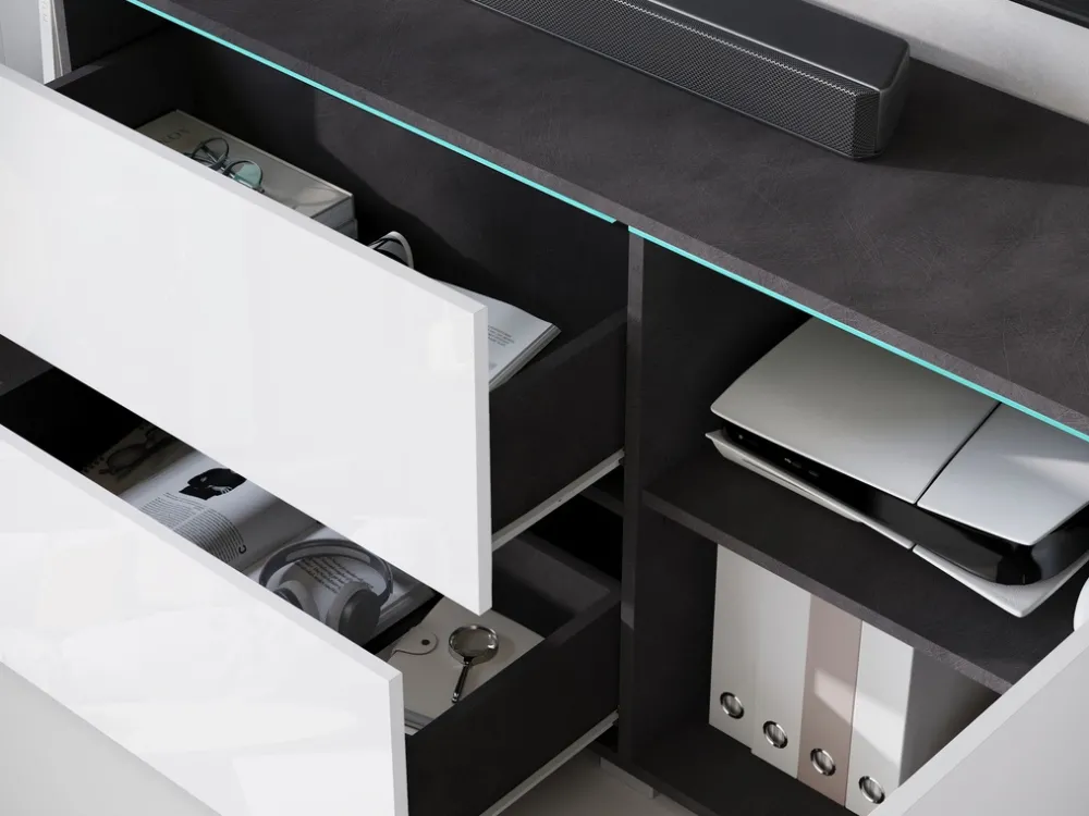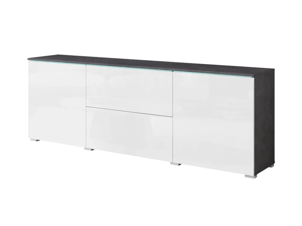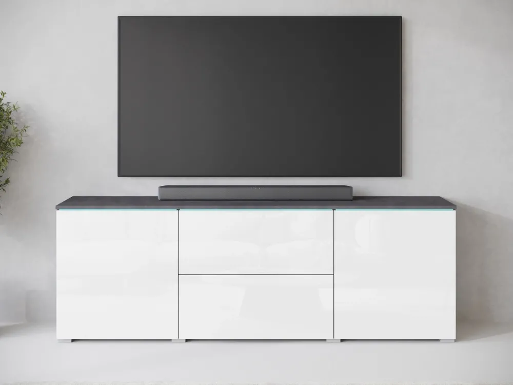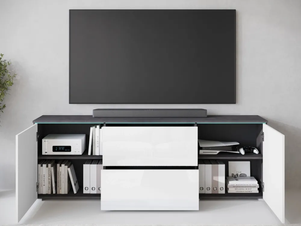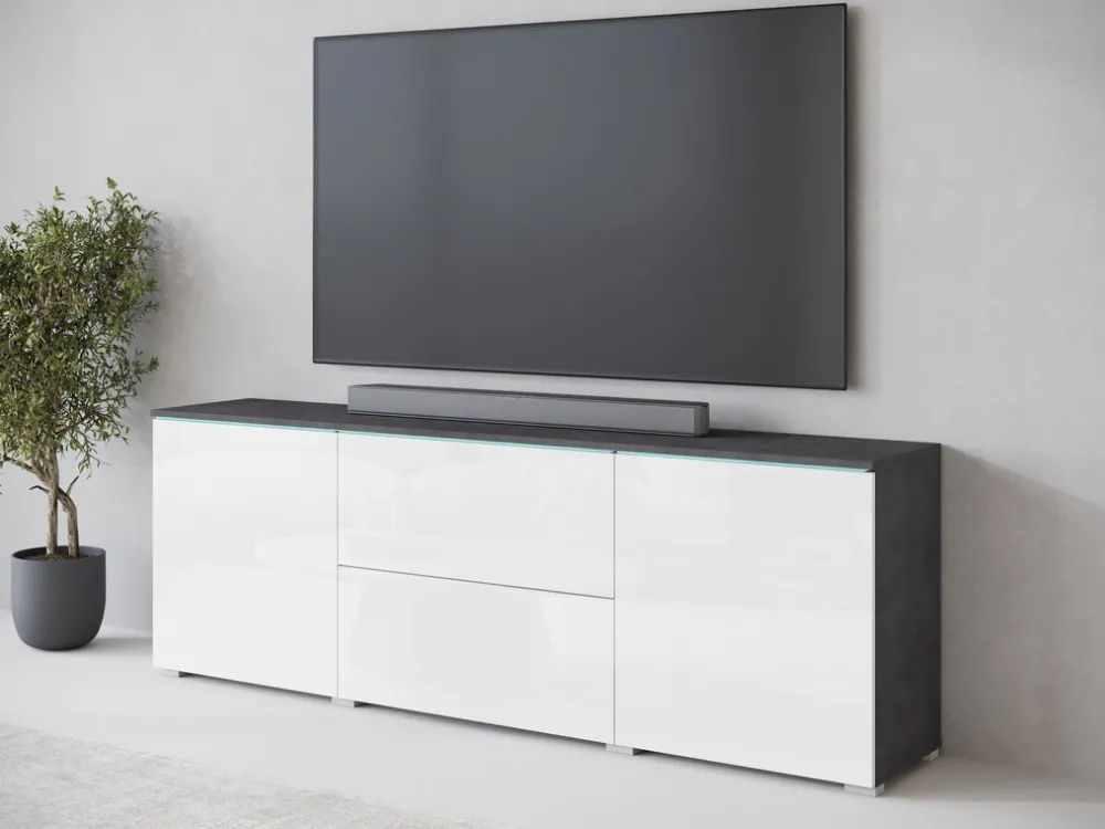 - Komoda o szerokości 180 cm łączy biały połysk z kolorem matera i antracytowym tłem, tworząc nowoczesny efekt. Push-to-open, regulowane półki i opcjonalne LED zapewniają styl i funkcjonalność w jednym meblu RTV.