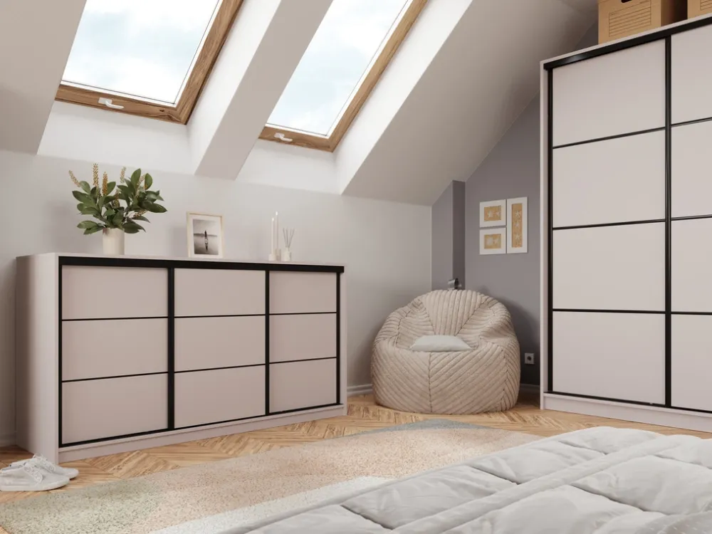 - Komoda przesuwna 180 cm LOFT charakteryzuje się pojemnym wnętrzem, które składa się z aluminiowego drążka na wieszaki oraz czterech pojemnych szuflad na bieliznę i dwóch półek. Drzwi komody poruszają się na stalowym systemie przesuwnym.