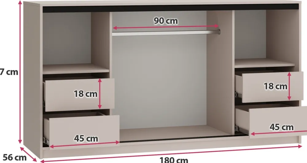 Po lewej i prawej stronie komody znajdują się po dwie pojemne szuflady, które świetnie sprawdzą się do organizacji drobiazgów lub odzieży Nad każdą z nich umieszczono półkę, która oferuje dodatkowe miejsce na większe przedmioty lub dekoracje. W środkowej części mebla znajduje się aluminiowy drążek na wieszaki, idealny do przechowywania ubrań wymagających powieszenia