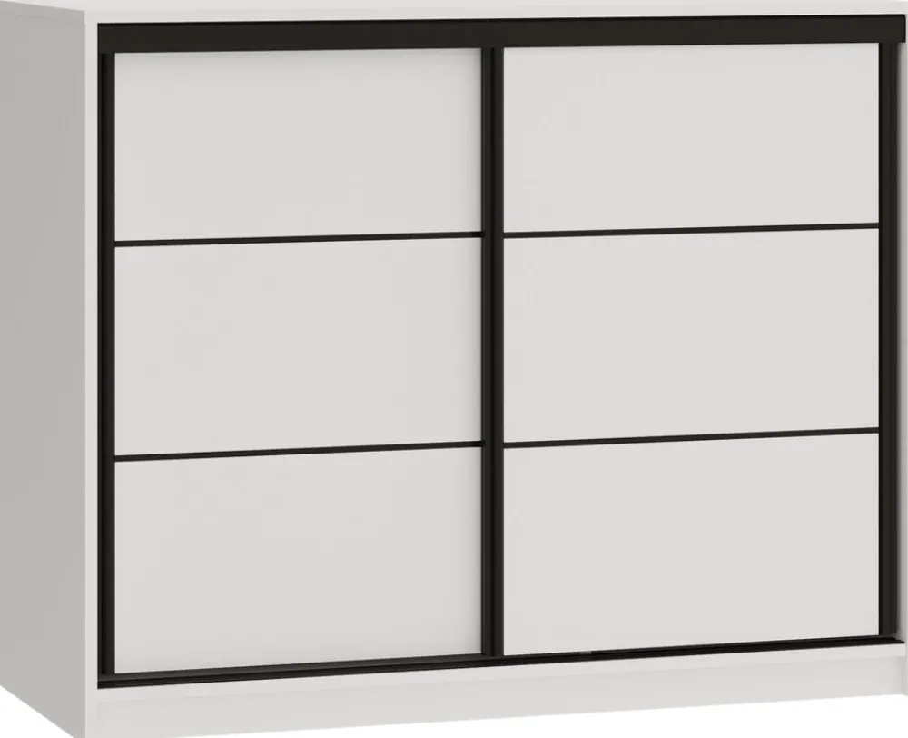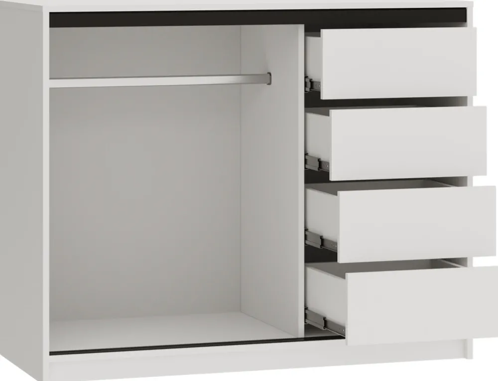 - Biała komoda przesuwna LOFT charakteryzuje się pojemnym wnętrzem, które składa się z aluminiowego drążka na wieszaki oraz czterech pojemnych szuflad na bieliznę i akcesoria. Drzwi komody poruszają się na stalowym systemie przesuwnym w czarnym kolorze.