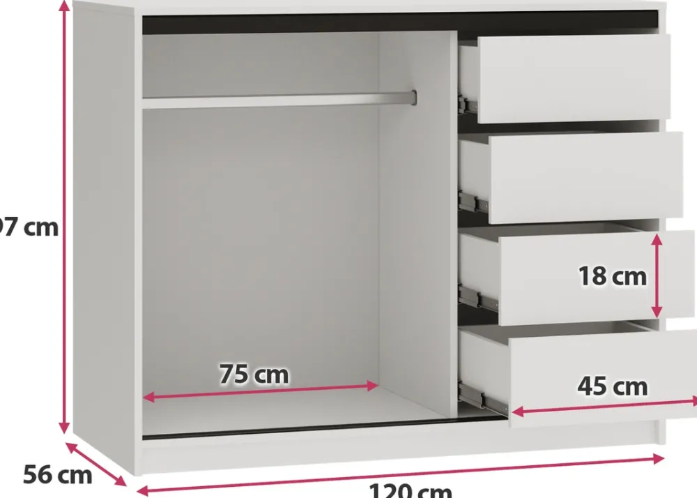 W lewej części komody znajduje się aluminiowy drążek na wieszaki, idealny do przechowywania ubrań wymagających powieszenia. Prawa strona to cztery praktyczne szuflady na prowadnicach kulkowych, które sprawdzą się w organizacji mniejszych przedmiotów. Dzięki temu loftowa komoda LOFT z powodzeniem spełnia różnorodne potrzeby przechowywania, będąc jednocześnie ozdobą wnętrza