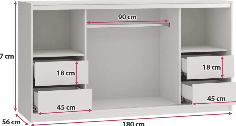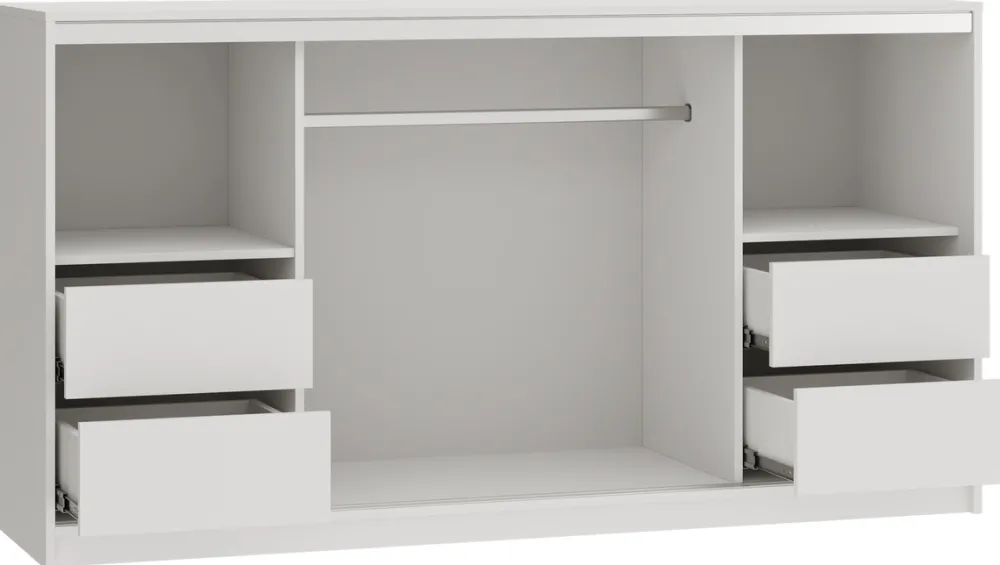 Po lewej i prawej stronie komody znajdują się po dwie przestronne szuflady, które są idealne do przechowywania mniejszych przedmiotów lub odzieży. Nad każdą szufladą umieszczono półkę, która oferuje dodatkowe miejsce na większe przedmioty, organizery lub dekoracje Środkowa część komody została wyposażona w aluminiowy drążek na wieszaki, co czyni ją idealnym rozwiązaniem do przechowywania ubrań wymagających powieszenia