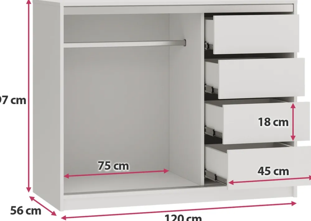 - Komoda przesuwna 120 cm charakteryzuje się swoimi drzwiami, które poruszają się na stalowym systemie przesuwnym. Po lewej stronie komody znajduje się aluminiowy drążek na wieszaki, natomiast po prawej stronie cztery głębokie szuflady.