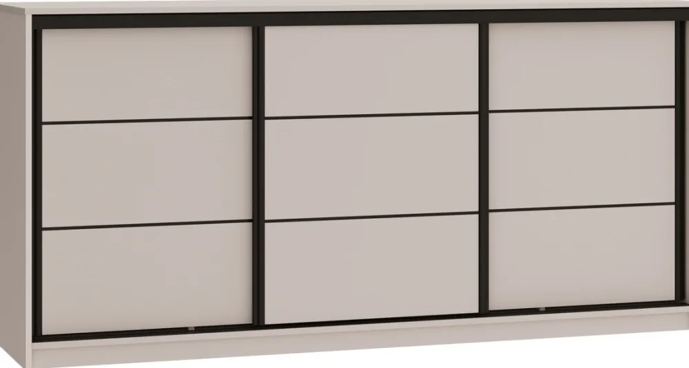 Komoda przesuwna LOFT o szerokości 200 cm to połączenie nowoczesnego designu i praktycznych rozwiązań Trzy drzwi osadzone na metalowym systemie przesuwnym w czarnym kolorze wprowadzają industrialny charakter do wnętrza, jednocześnie ułatwiając dostęp do przechowywanych rzeczy