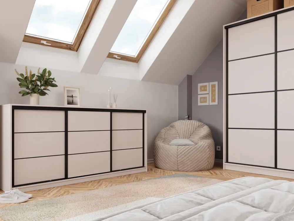 - Komoda przesuwna 200 cm LOFT charakteryzuje się pojemnym wnętrzem, które składa się z aluminiowego drążka na wieszaki oraz czterech pojemnych szuflad na bieliznę i dwóch półek. Drzwi komody poruszają się na stalowym systemie przesuwnym.