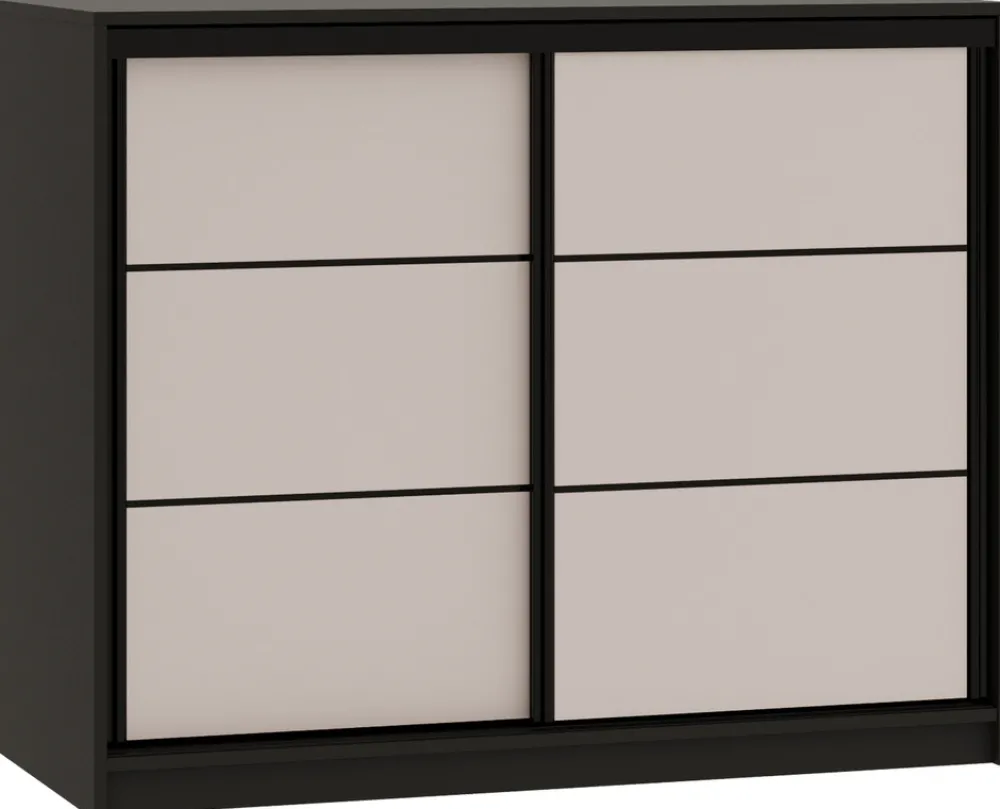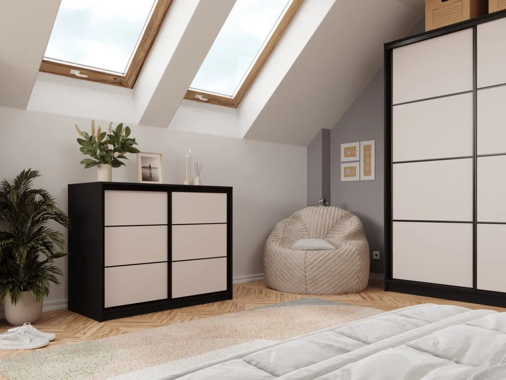- Komoda przesuwna LOFT charakteryzuje się pojemnym wnętrzem, które składa się z aluminiowego drążka na wieszaki oraz czterech pojemnych szuflad na bieliznę i akcesoria. Drzwi komody poruszają się na stalowym systemie przesuwnym w czarnym kolorze.