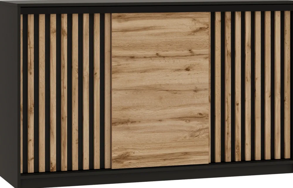 Komoda przesuwna z lamelami LOFT o szerokości 160 cm to doskonałe połączenie nowoczesnego designu i funkcjonalności. Trzy drzwi, osadzone na solidnym metalowym systemie przesuwnym, zapewniają płynne i ciche otwieranie, co czyni ją wyjątkowo praktycznym rozwiązaniem do każdego wnętrza.