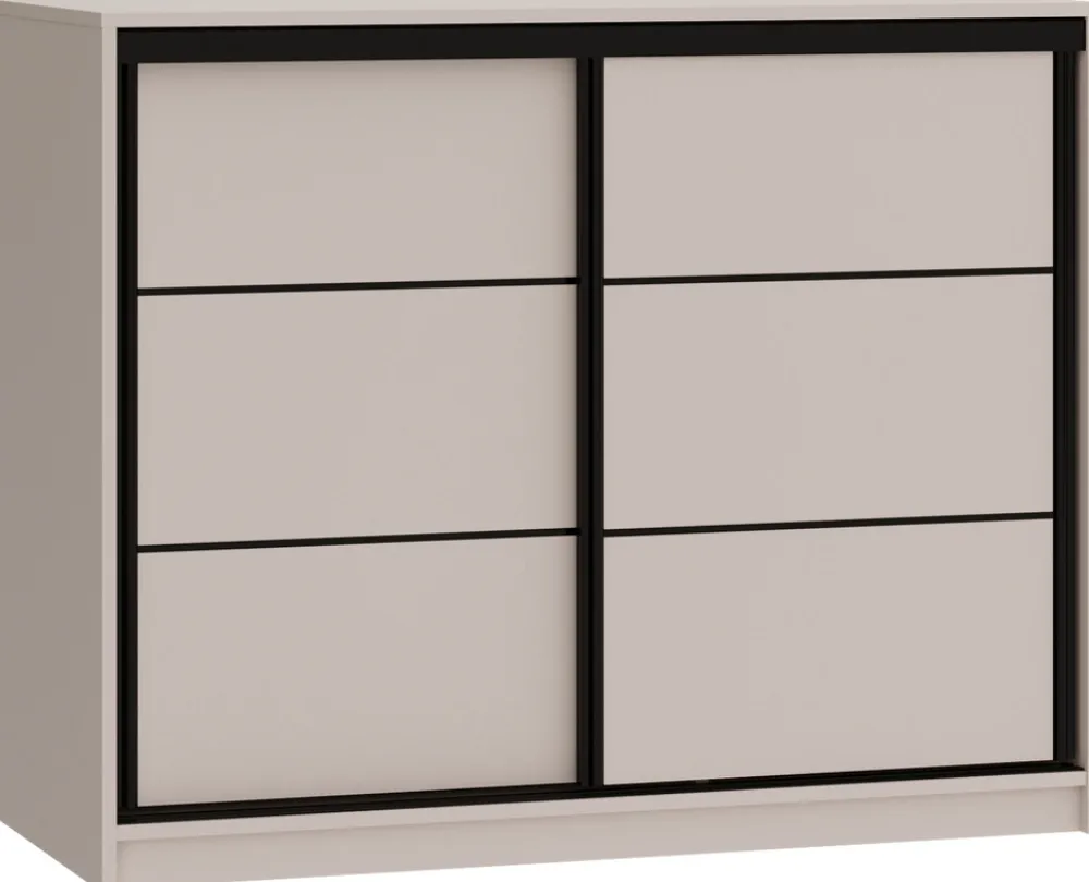 Komoda z szufladami LOFT to połączenie nowoczesnego designu i funkcjonalności. Komoda przesuwna o szerokości 120 cm wyróżnia się dwudrzwiową konstrukcją opartą na metalowym systemie przesuwnym w czarnym kolorze. To rozwiązanie nie tylko podkreśla industrialny charakter mebla, ale także pozwala na wygodne korzystanie z przestrzeni wewnątrz
