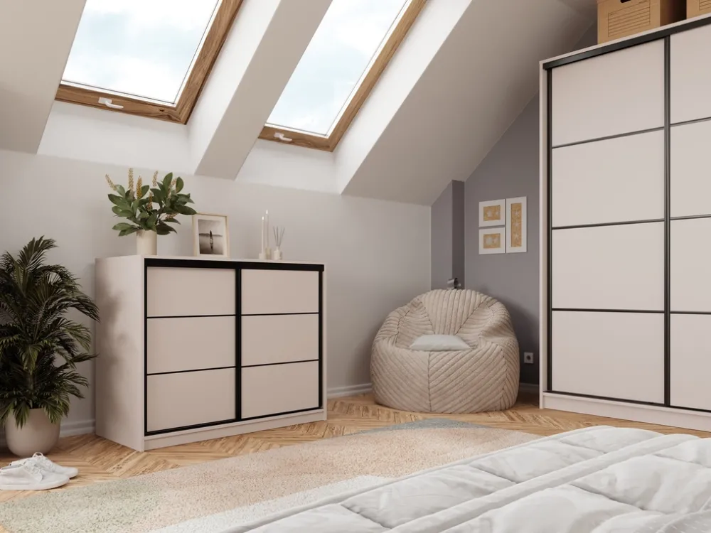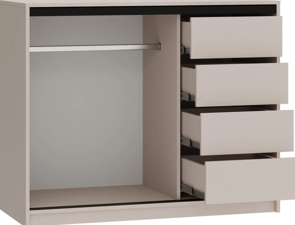 - Komoda przesuwna LOFT charakteryzuje się pojemnym wnętrzem, które składa się z aluminiowego drążka na wieszaki oraz czterech pojemnych szuflad na bieliznę i akcesoria. Drzwi komody poruszają się na stalowym systemie przesuwnym w czarnym kolorze.