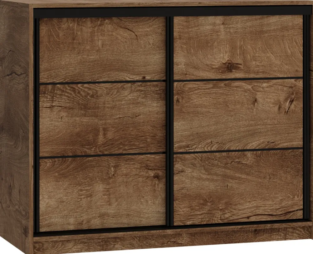 Komoda z szufladami LOFT to połączenie nowoczesnego designu i funkcjonalności. Komoda przesuwna o szerokości 120 cm wyróżnia się dwudrzwiową konstrukcją opartą na metalowym systemie przesuwnym w czarnym kolorze. To rozwiązanie nie tylko podkreśla industrialny charakter mebla, ale także pozwala na wygodne korzystanie z przestrzeni wewnątrz