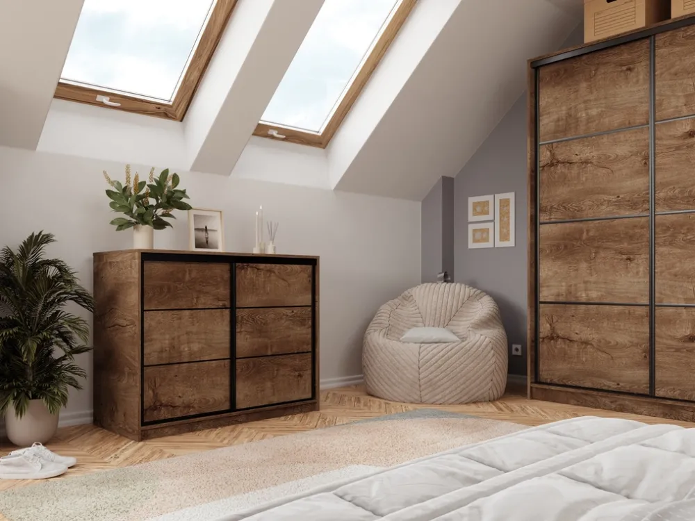Mebel wykonano z trwałej płyty laminowanej o grubości 16 mm, a jego obrzeża zabezpieczono wytrzymałą okleiną ABS. Takie wykonanie sprawia, że komoda do sypialni LOFT jest odporna na codzienne użytkowanie i długo zachowuje swój estetyczny wygląd
