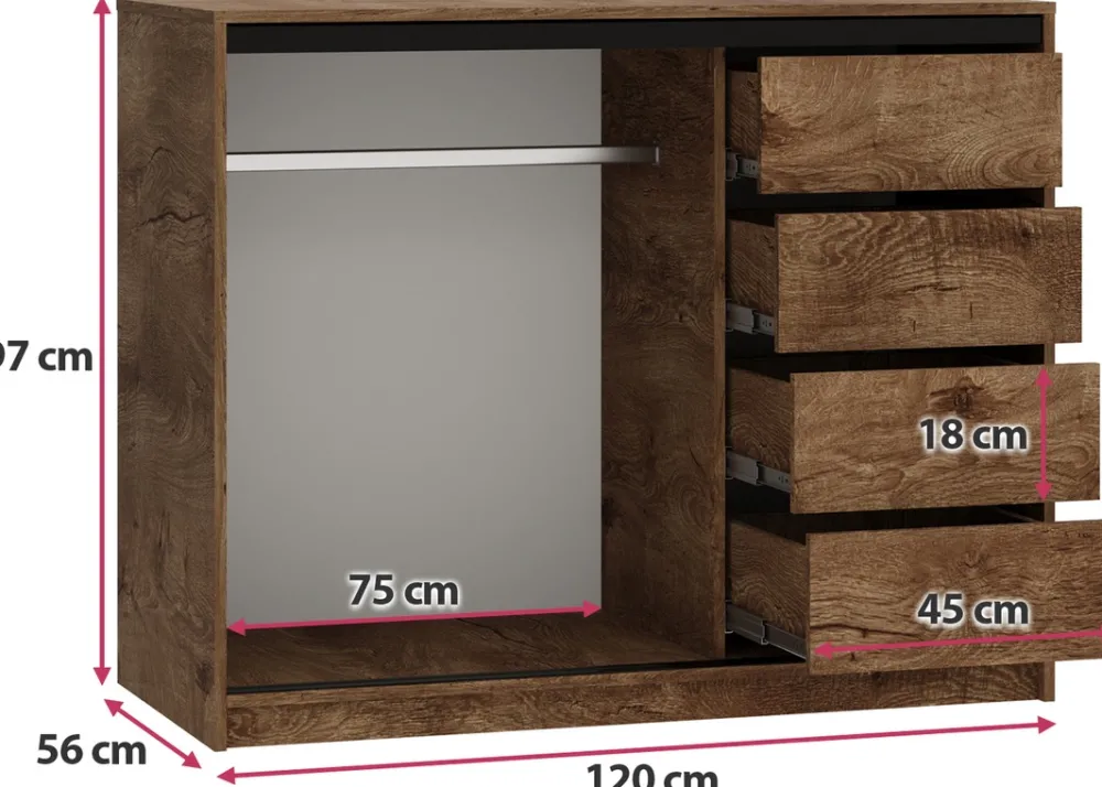 W lewej części komody znajduje się aluminiowy drążek na wieszaki, idealny do przechowywania ubrań wymagających powieszenia. Prawa strona to cztery praktyczne szuflady na prowadnicach kulkowych, które sprawdzą się w organizacji mniejszych przedmiotów. Dzięki temu loftowa komoda LOFT z powodzeniem spełnia różnorodne potrzeby przechowywania, będąc jednocześnie ozdobą wnętrza