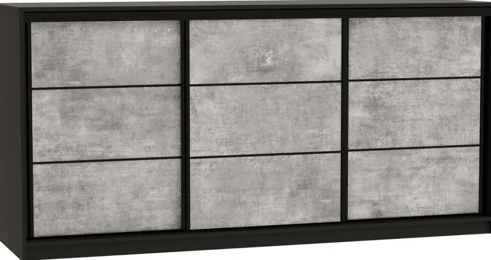 Komoda przesuwna LOFT o szerokości 200 cm to połączenie nowoczesnego designu i praktycznych rozwiązań Trzy drzwi osadzone na metalowym systemie przesuwnym w czarnym kolorze wprowadzają industrialny charakter do wnętrza, jednocześnie ułatwiając dostęp do przechowywanych rzeczy