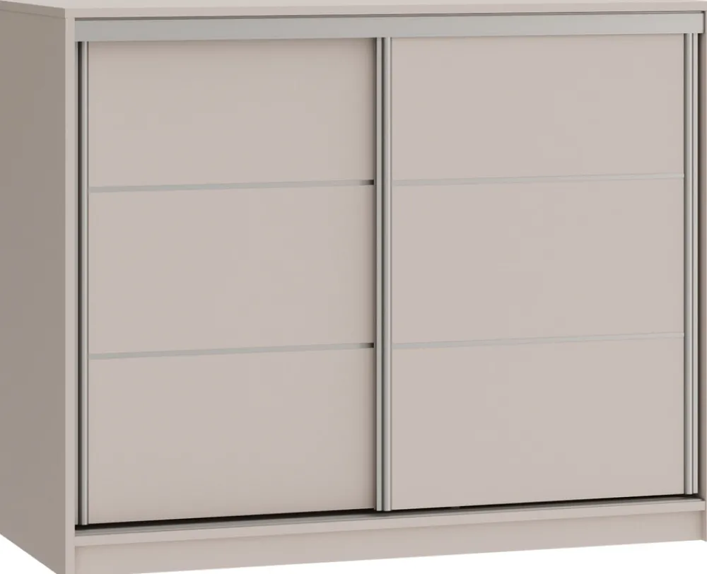 Komoda przesuwna TOP o szerokości 120 cm to doskonałe rozwiązanie dla osób poszukujących mebla, który łączy nowoczesny design z praktycznym układem. Dwoje drzwi zamontowane na metalowym systemie przesuwnym w srebrnym kolorze dodaje elegancji i umożliwia łatwy dostęp do wnętrza komody