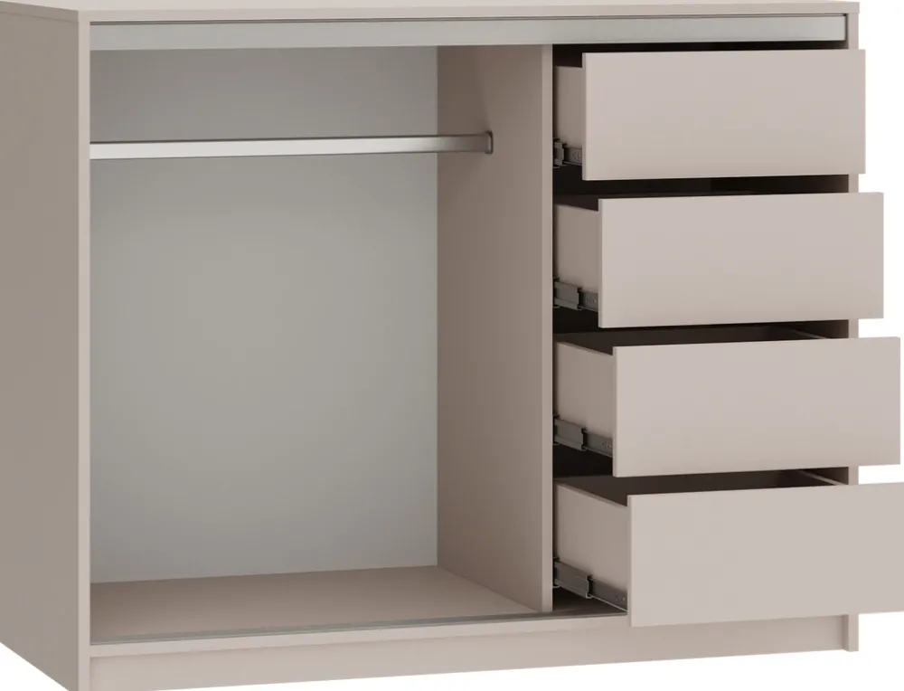 Po lewej stronie znajduje się aluminiowy drążek na wieszaki, który zapewnia wygodne przechowywanie odzieży wymagającej powieszenia. W prawej części umieszczono cztery przestronne szuflady poruszające się na prowadnicach kulkowych, które gwarantują płynne działanie i oferują dużo miejsca na bieliznę, dodatki czy inne akcesoria