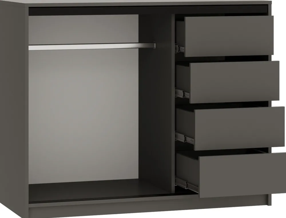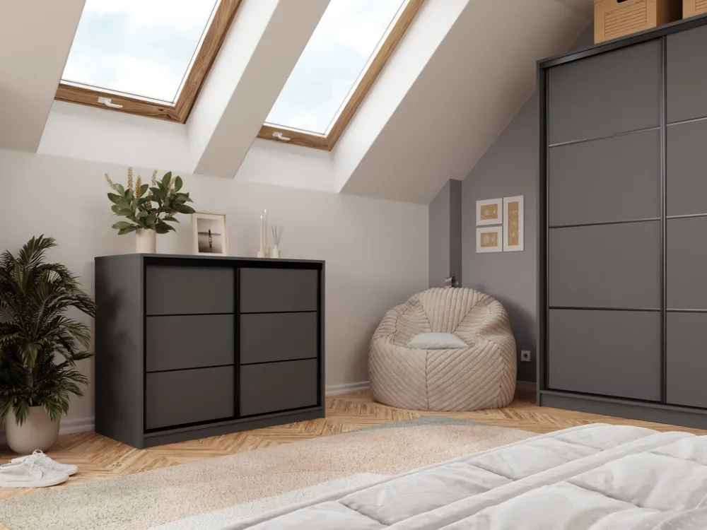 - Komoda przesuwna LOFT charakteryzuje się pojemnym wnętrzem, które składa się z aluminiowego drążka na wieszaki oraz czterech pojemnych szuflad na bieliznę i akcesoria. Drzwi komody poruszają się na stalowym systemie przesuwnym w czarnym kolorze.