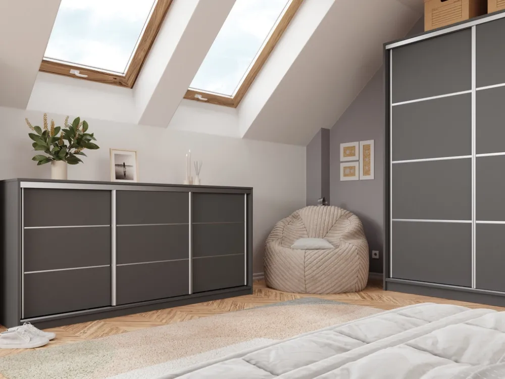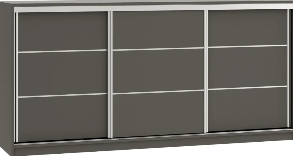 Komoda przesuwna TOP o szerokości 200 cm to propozycja, która łączy elegancki wygląd z praktycznymi rozwiązaniami. Trzy drzwi osadzone na metalowym systemie przesuwnym w srebrnym kolorze wprowadzają nowoczesny akcent i gwarantują łatwy dostęp do przechowywanych rzeczy