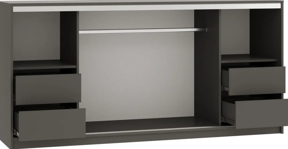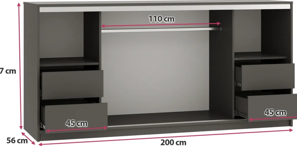 Po lewej i prawej stronie komody znajdują się po dwie przestronne szuflady, które są idealne do przechowywania mniejszych przedmiotów lub odzieży. Nad każdą szufladą umieszczono półkę, która oferuje dodatkowe miejsce na większe przedmioty, organizery lub dekoracje Środkowa część komody została wyposażona w aluminiowy drążek na wieszaki, co czyni ją idealnym rozwiązaniem do przechowywania ubrań wymagających powieszenia