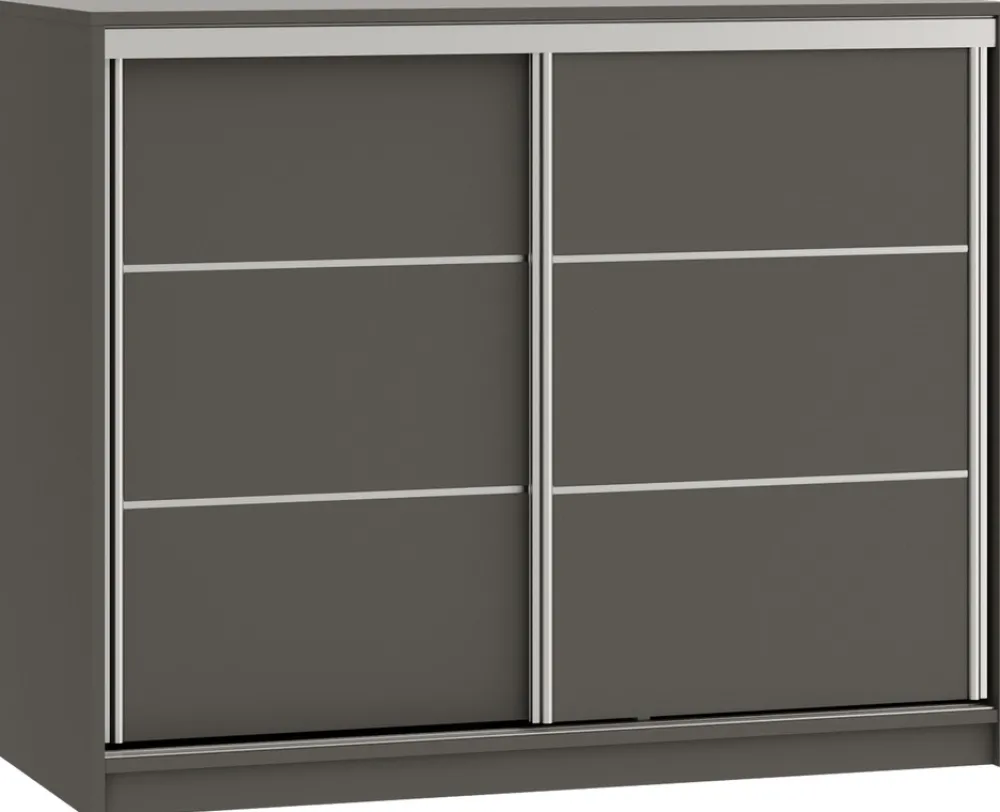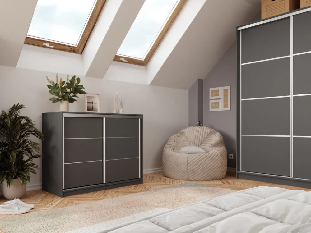 Komoda przesuwna TOP o szerokości 120 cm to doskonałe rozwiązanie dla osób poszukujących mebla, który łączy nowoczesny design z praktycznym układem. Dwoje drzwi zamontowane na metalowym systemie przesuwnym w srebrnym kolorze dodaje elegancji i umożliwia łatwy dostęp do wnętrza komody