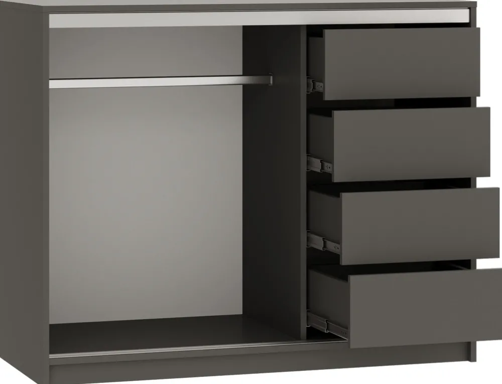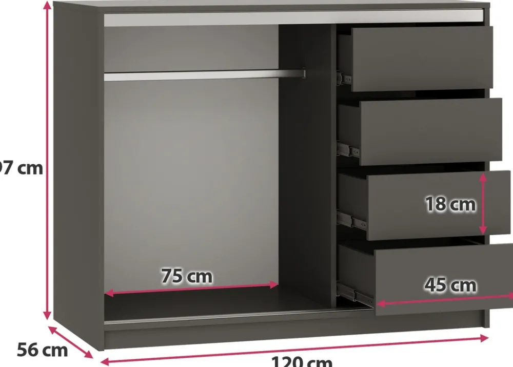 - Komoda przesuwna 120 cm charakteryzuje się swoimi drzwiami, które poruszają się na stalowym systemie przesuwnym. Po lewej stronie komody znajduje się aluminiowy drążek na wieszaki, natomiast po prawej stronie cztery głębokie szuflady.