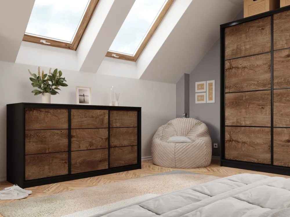 Loftowa komoda z szufladami LOFT 180 cm to idealne rozwiązanie do sypialni, garderoby lub przedpokoju Dzięki funkcjonalności i surowemu stylowi doskonale wpisuje się w nowoczesne wnętrza, oferując nie tylko przestrzeń do przechowywania, ale również wyjątkowy akcent w Twoim domu