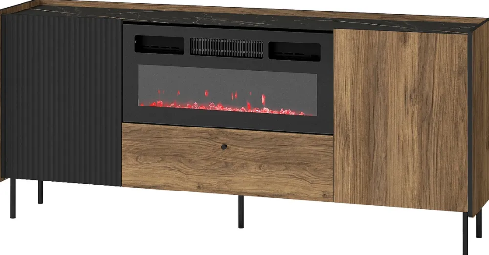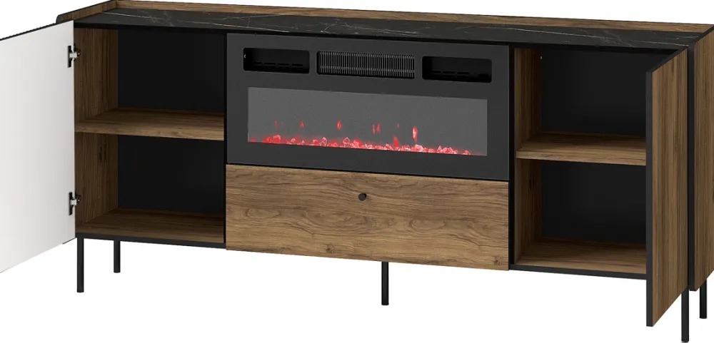 - Komoda PINNACLE o szerokości 180 cm, wyposażona w szufladę oraz kominek. Całość wykonana z płyty laminowanej 16 mm, wzmocnione okleiną PCV. Kominek posiada funkcję grzewczą: 18-28 °C oraz kolorystykę płomieni w kolorach: niebieski, czerwony, fioletowy.