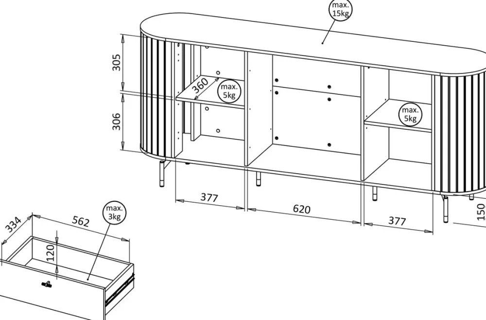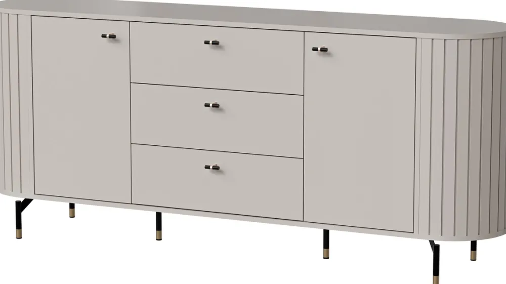 Elegancka komoda do salonu ZELDA zachwyca wyjątkowym designem, który harmonijnie łączy nowoczesność z funkcjonalnością. Zaokrąglone boczki, wykonane z solidnej płyty MDF, dodają jej subtelnej elegancji i przytulnego charakteru, idealnie komponując się z każdym wnętrzem. Obrzeża wykończone trwałym materiałem ABS podkreślają staranność wykonania, a jednocześnie chronią komodę przed uszkodzeniami.