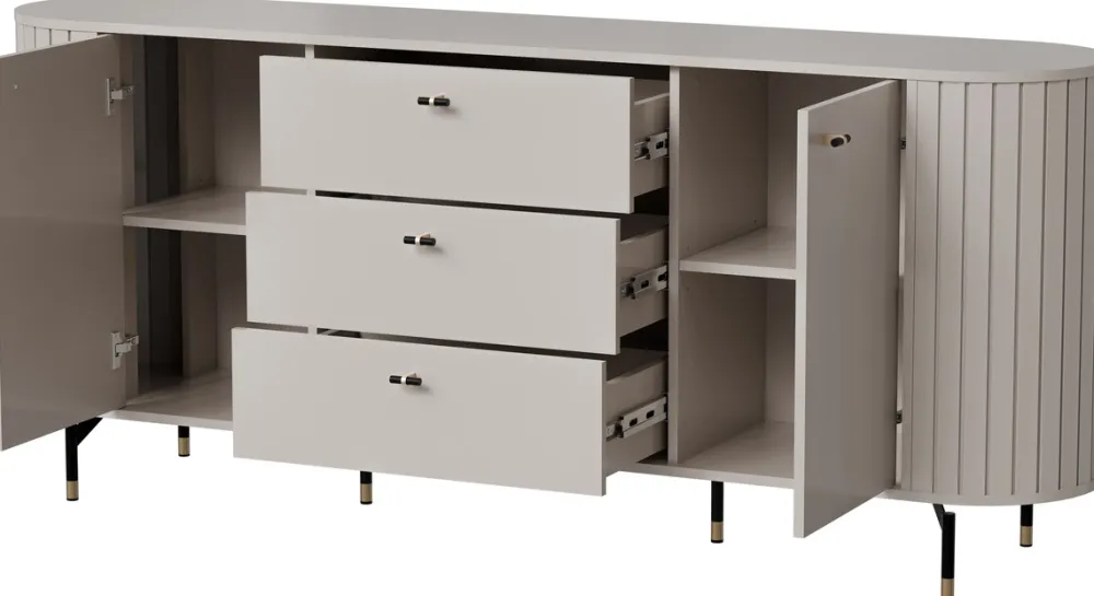 - Komoda do salonu 190 cm ZELDA charakteryzuje się swoimi zaokrąglonymi boczkami, które zostały wykonane z płyty MDF. W centralnej części mebla znajdują się dwie szuflady, natomiast po bokach drzwi z systemem cichego domyku a za nimi półki.